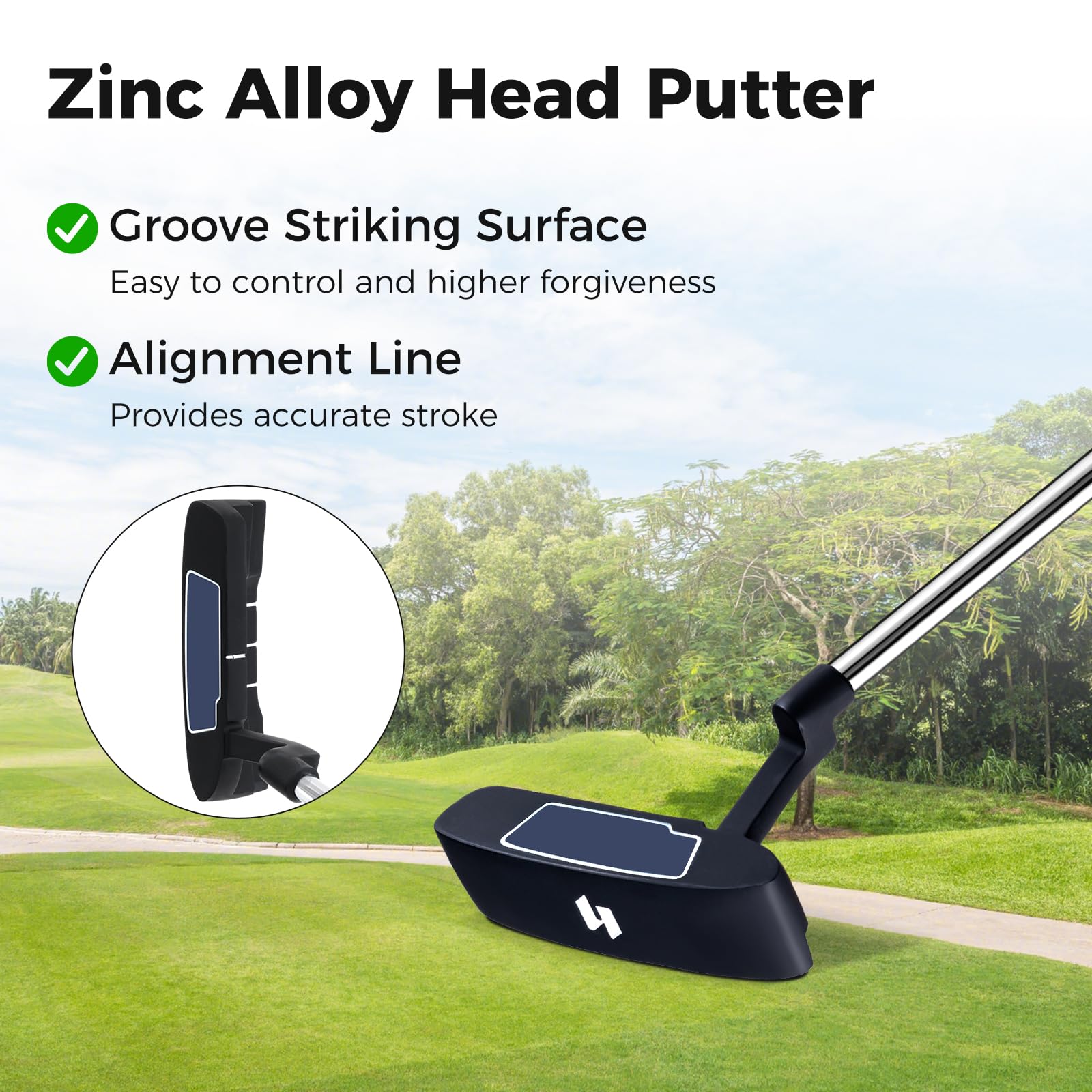 - Putter with Aiming Design: Designed with an alignment line, this well-made zinc alloy head putter keeps the golf ball on the line, providing accurate stroke for higher forgiveness on off-centre shots. Additionally, the groove striking surface of the golf club enhances the friction on impact, making it easier to control.