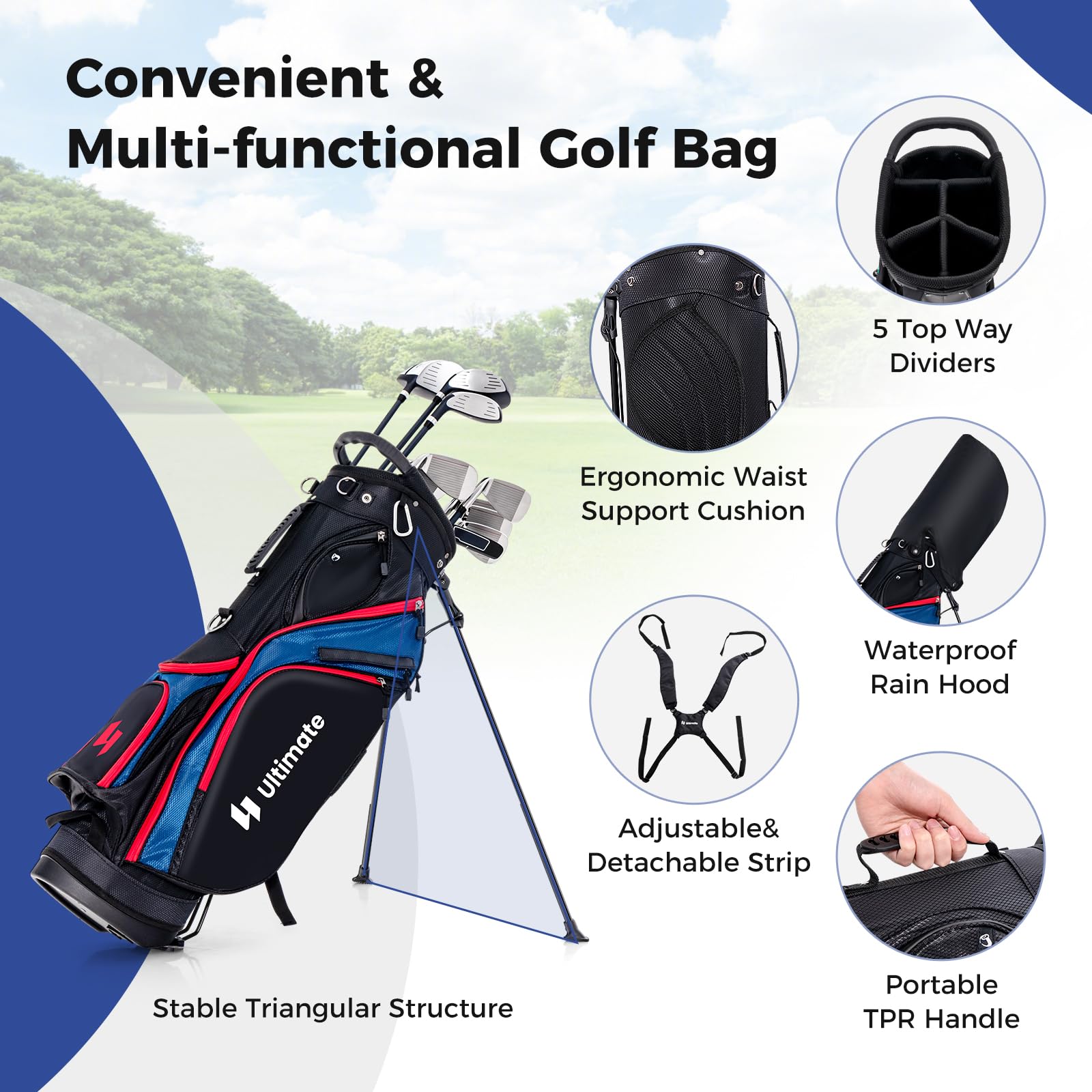 - Convenient & Multi-functional Golf Bag: This golf bag features 5 top-way dividers and 7 zipped pockets for organized club and equipment storage. Furthermore, the adjustable and detachable straps with portable TPR handle and ergonomic waist support cushion provide a more comfortable carrying experience. Plus, the waterproof rain hood and umbrella holder are ready for rainy day practice.