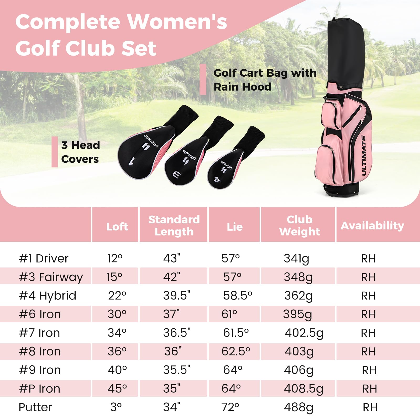 - 【9-Piece Complete Golf Set】 This women’s golf club set consists of #1 driver, #3 fairway, #4 hybrid, #6 & #7 & #8 & #9 & #P irons and putter. What’s more, each wood is equipped with a head cover for better protection.