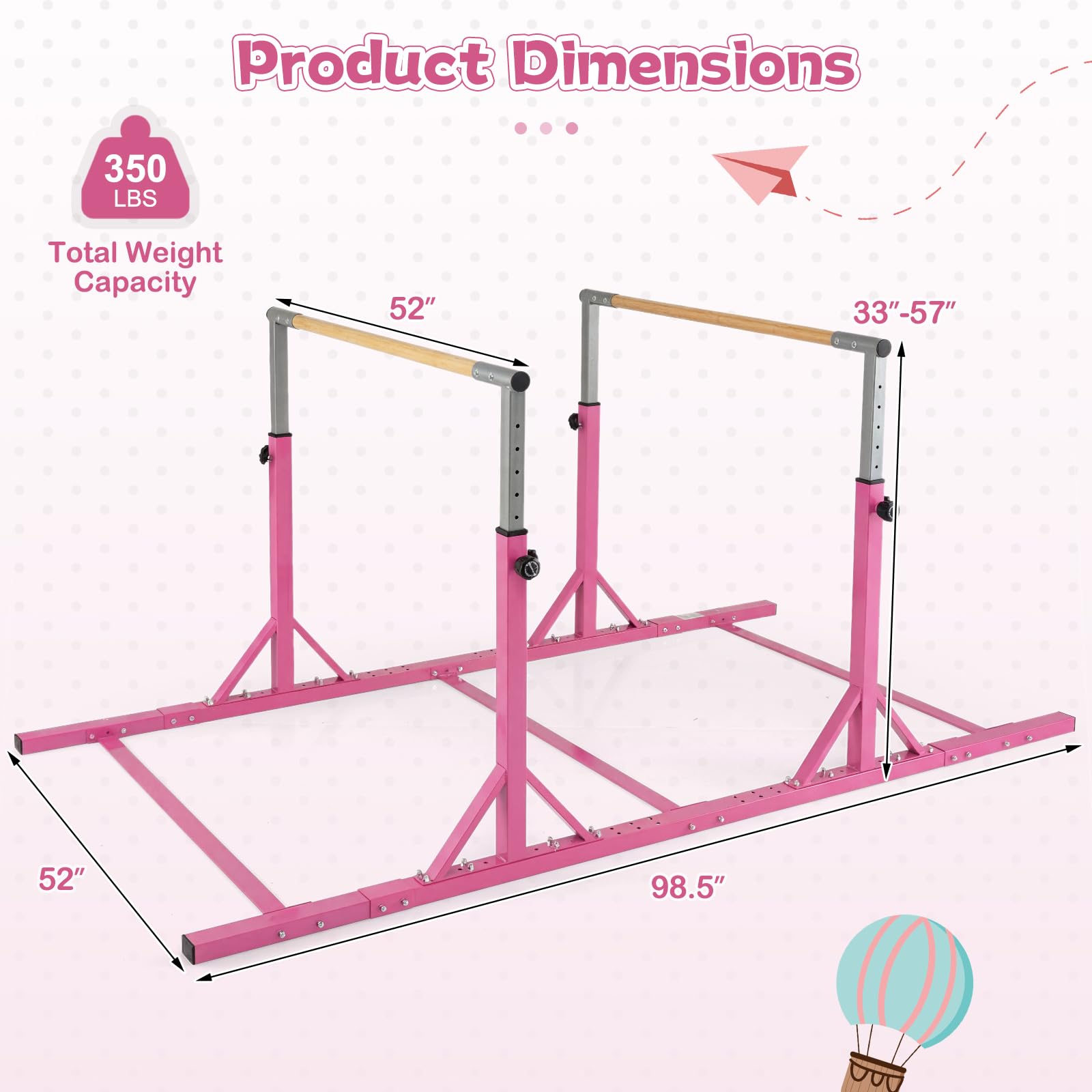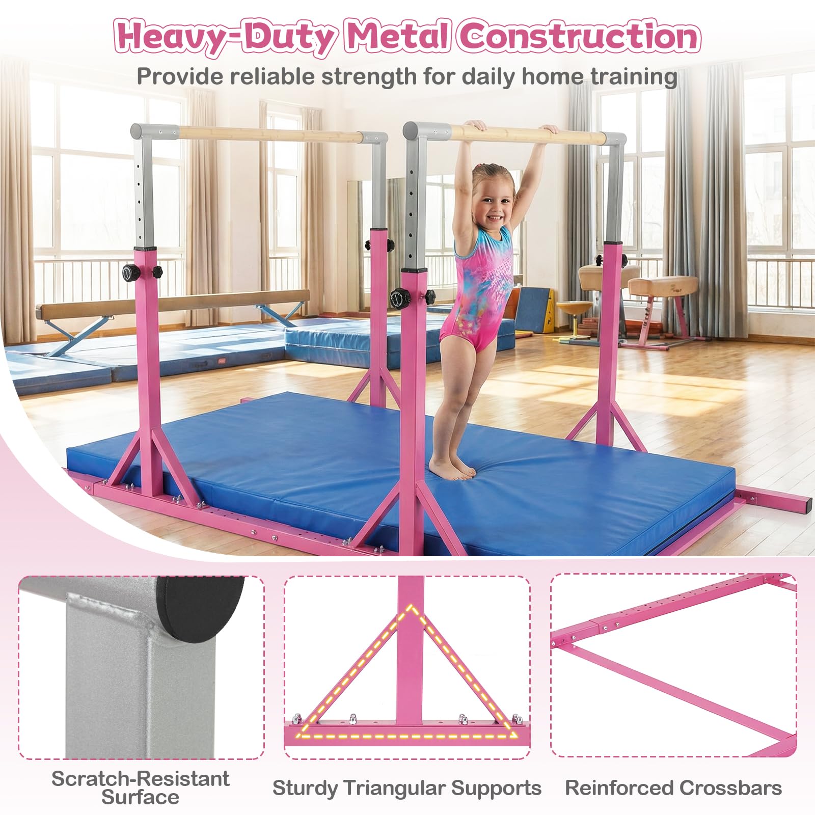 Its heavy-duty metal frame provides dependable support for various exercises, while the adjustable height and width allow the bar to adapt to different body sizes and skill levels as kids grow. Secure tube connections and a triangular base structure enhance stability during movement, giving parents peace of mind. Suitable for children ages 3 and up, this home gymnastics equipment helps improve strength, balance, and coordination, making it an excellent addition to schools, playrooms, or dedicated practice spaces.