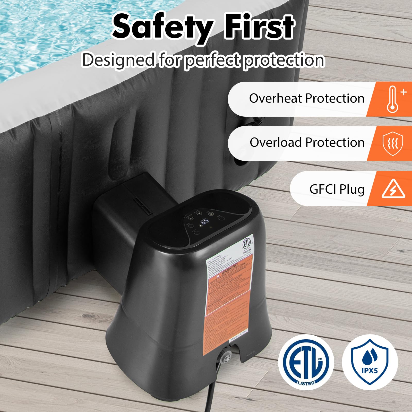 Experience the ultimate warmth and relaxation with this advanced heater pump, boasting a PTC heating system that provides 1350W high power and 68-104℉ temperature range for a comfortable and energy-saving soak. The control unit’s bubble setting offers a 20-minute bubble massage before automatically shutting off, and is not compatible with the heating mode. Its filtration system ensures clean water and alerts you to change the filter cartridge after 168 hours. Control is a breeze with a touch panel and LED display, complemented by safety features like child lock and frost protection. Safety first! This SPA pump is fortified with multiple safeguards, including an IPX5 rating, protection against overheating and overload, and a GFCI plug, ensuring a secure and enjoyable experience every time.