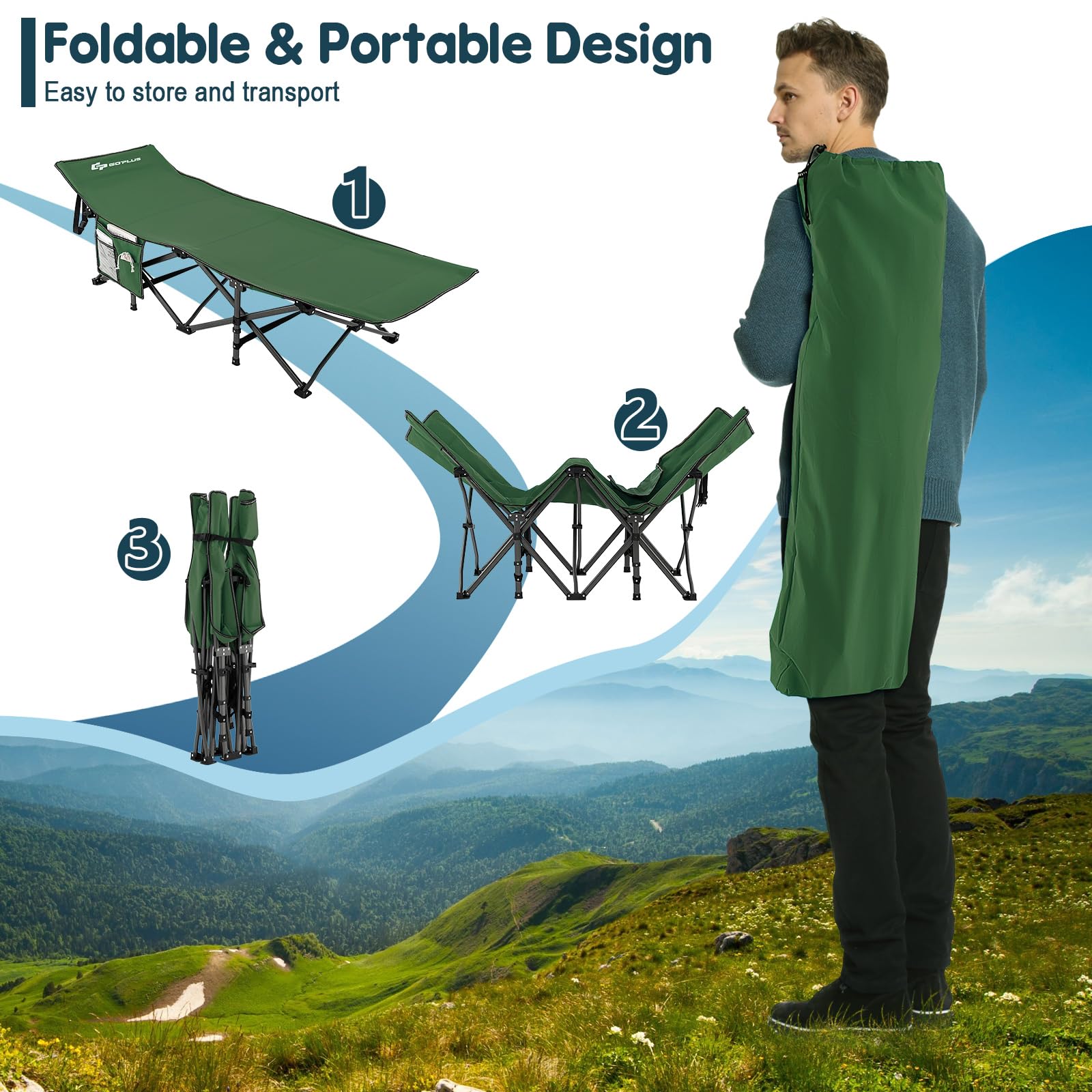 - Foldable & Portable Design: The portable sleeping cot can be quickly folded and unfolded in seconds without tools. And an elastic band will securely fix the folding frame. With a convenient carry bag, the camping cot can be easily stored and transported for future use.