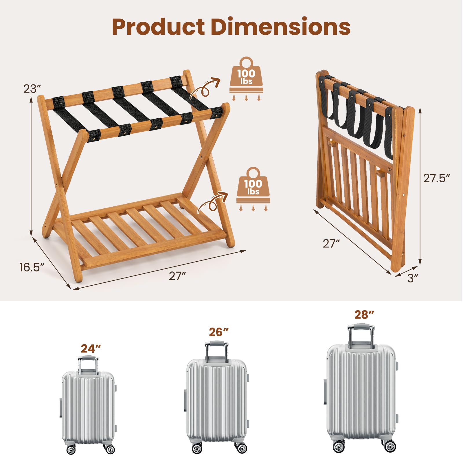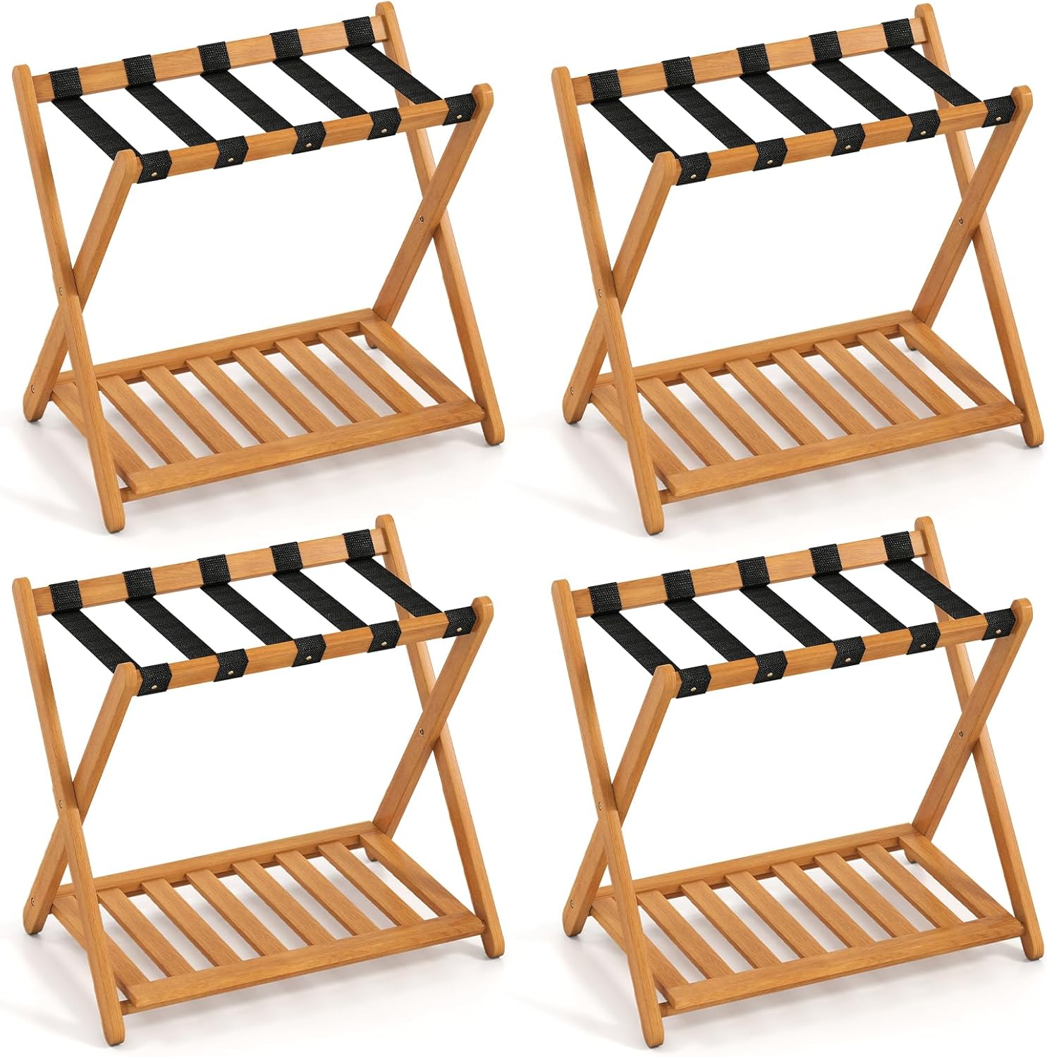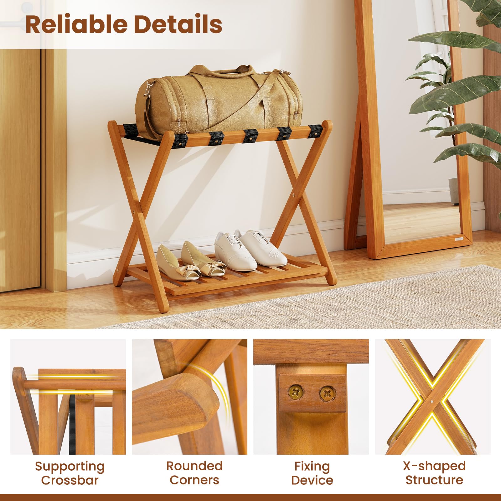 These solid wood luggage racks are designed with your convenience in mind. The 2-tier storage offers ample room for your suitcase and scattered clothing, while the folding mechanism allows for easy storage and transportation when they are not in use. Meanwhile, crafted from premium acacia wood, these suitcase stands boast great strength and stability, providing firm support with its X-shaped structure and extra crossbar. There are more reliable details such as rounded corners and splinter-free surface to ensure safety.