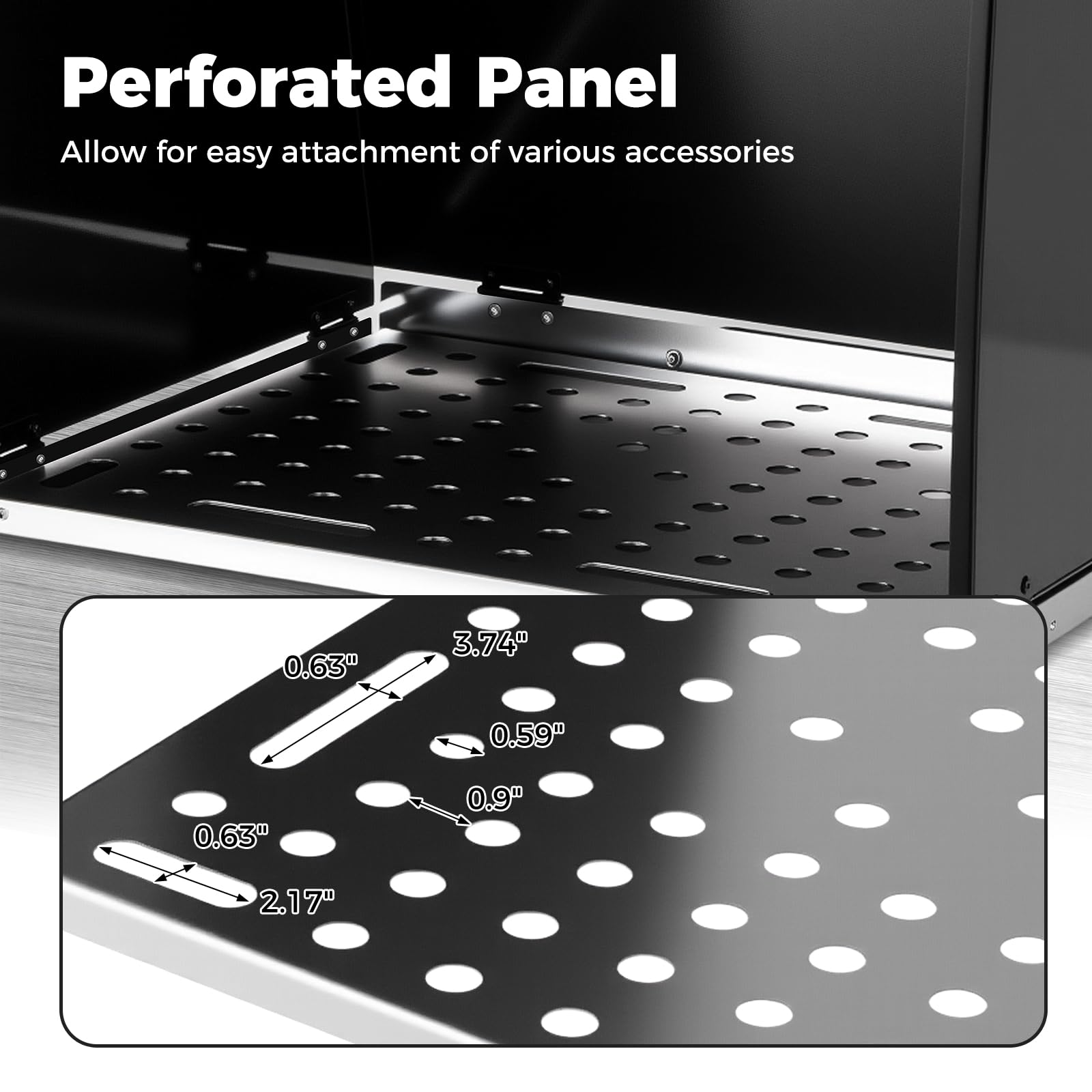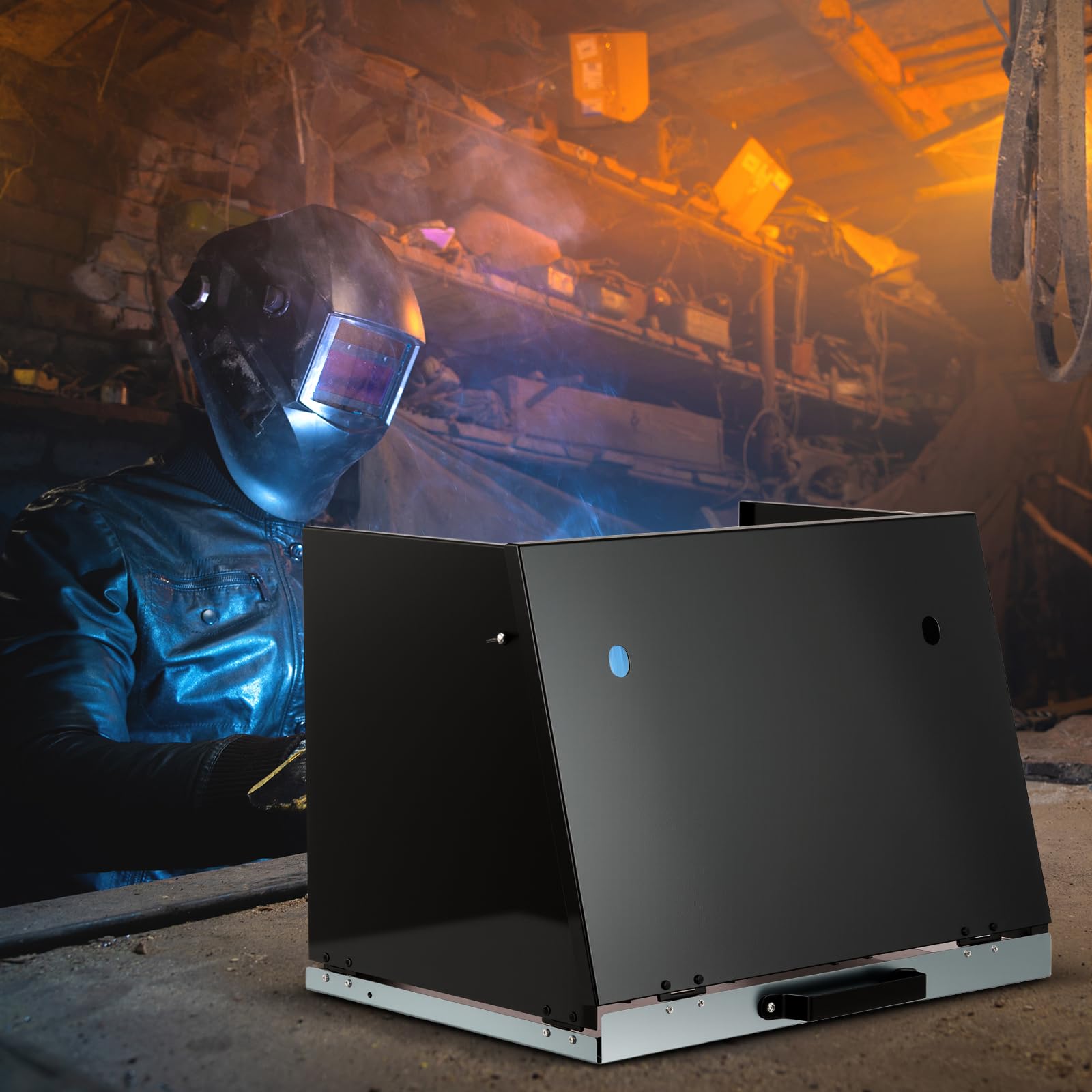 Crafted from heavy-duty and heat-resistant galvanized metal, this work table ensures longevity and reliable performance during high-temperature tasks. Additionally, the innovative 3-sided protective board buffers against sparks, flames and debris, safeguarding your surroundings and simplifying complex projects. Enhanced with a perforated panel featuring 8 tool slots and 0.59" fixture holes, this portable workbench promises optimal organization and easy access to your essentials. Moreover, its portable design effortlessly folds with a handle for swift transport, making it perfect for varied work environments.