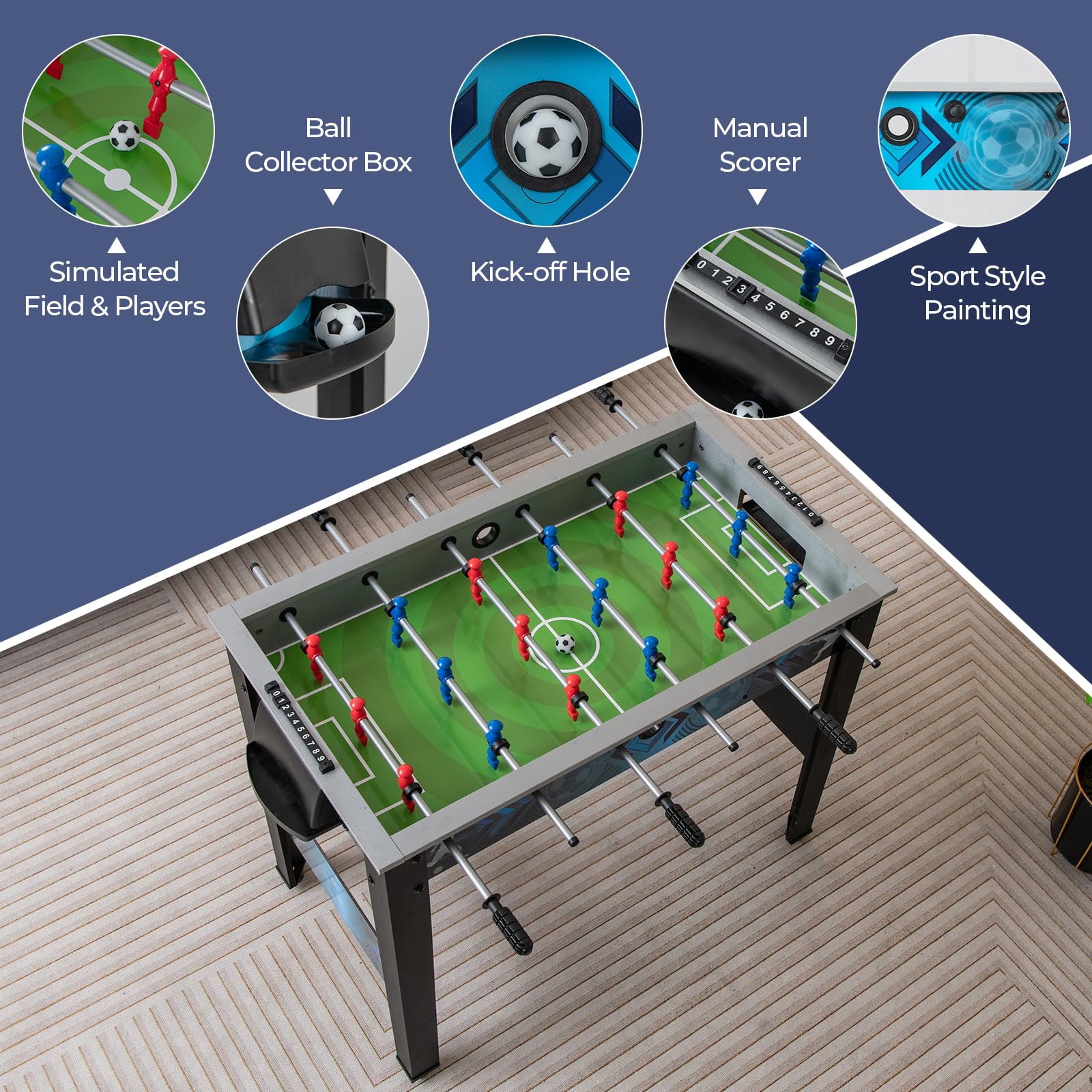 Enhances gameplay with comfortable handles, sturdy rods, realistic players, and manual scorer