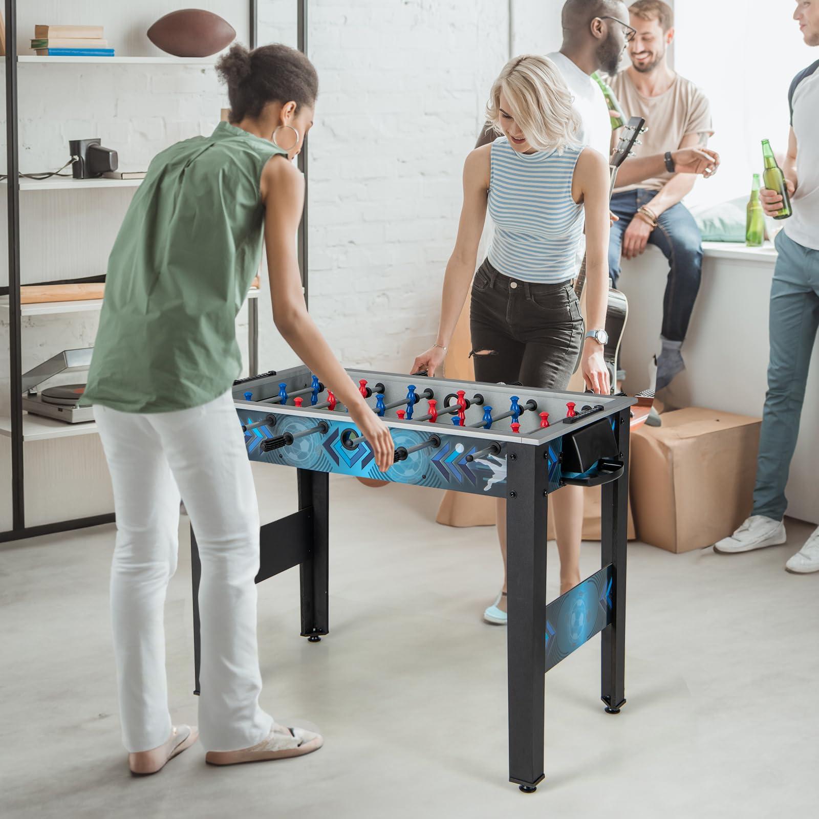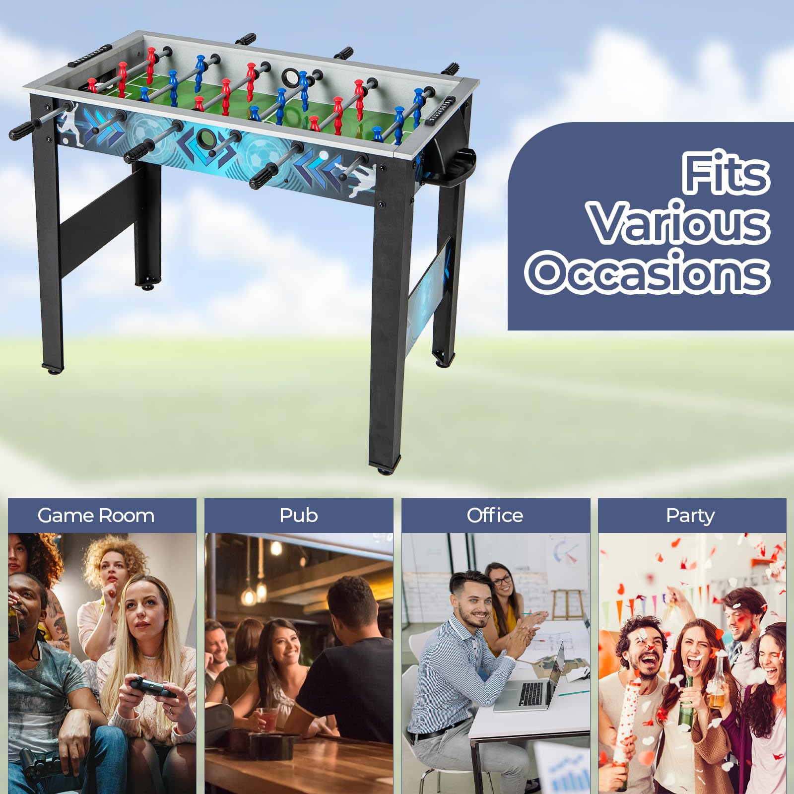 Experience the thrill of foosball with our versatile and engaging foosball table, designed to provide enjoyable gameplay for players of all ages while reducing screen time. Furthermore, it's a versatile choice that can be enjoyed at family gatherings or friendly competitions, fostering hand-eye coordination and integration skills while strengthening relationships. Additionally, suitable for various settings like game rooms, basements, parties, or offices, this table provides endless entertainment and bonding opportunities. Moreover, our game table features comfortable non-slip handles and sturdy rods for better control and accurate shooting. Besides, crafted from premium materials with a table structure, supported by four legs and nonslip footpads, this foosball table ensures durability and long-lasting performance.
