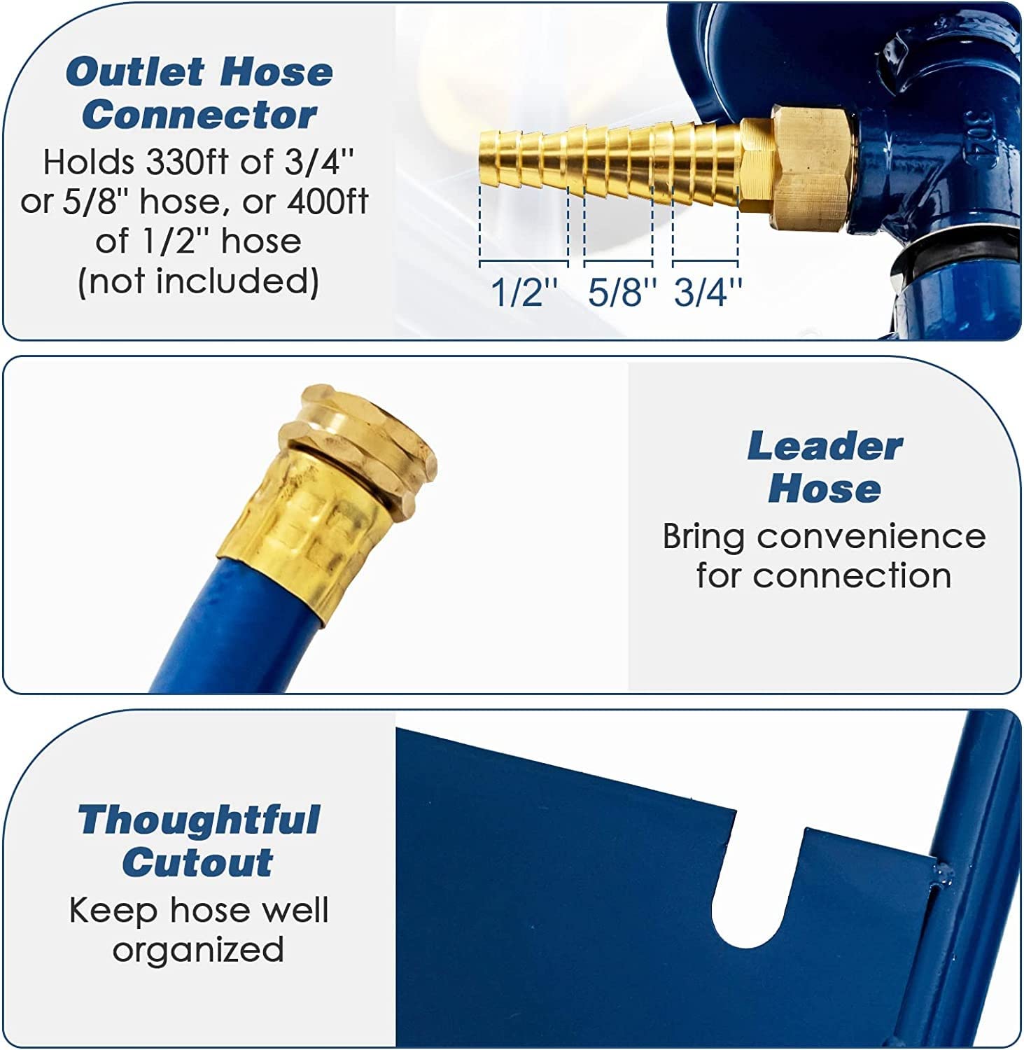 The garden hose reel cart can hold 330 ft of (3/4"), (5/8" hose, or 400 ft of (1/2" hose
