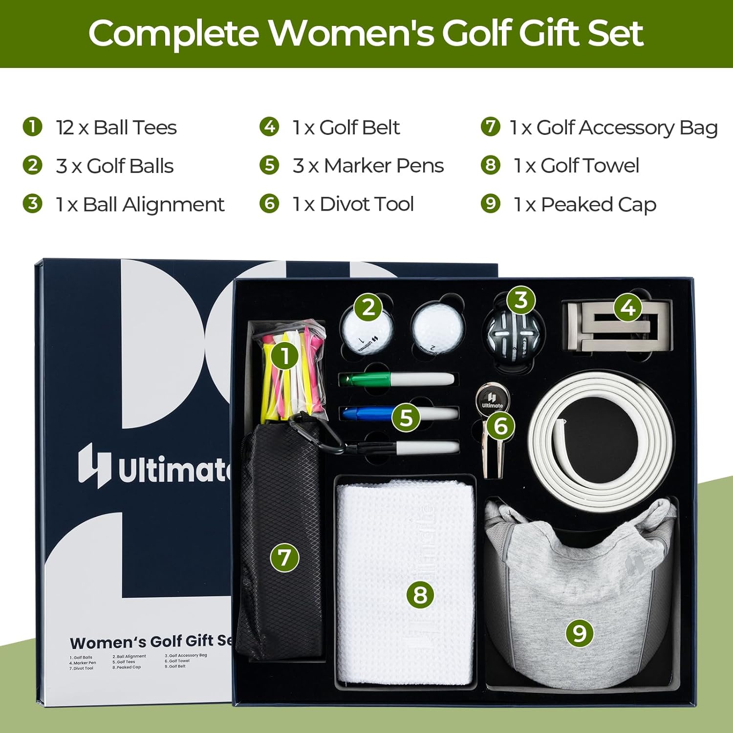 Whether you're a seasoned player or just starting out, this all-inclusive golf accessories set offers key essentials that enhance your golfing experience. It features 3 standard golf balls and 12 sturdy golf tees, providing reliable performance. The golf towel with a carabiner allows you to easily attach it to your bag for quick access. For style and comfort, the set includes a high-quality 2-layer cowhide belt and a lightweight hat with SPF 35 protection. The golf ball line marker tool and the divot tool with a removable ball marker help enhance your golfing precision while ensuring easy repair on the greens. What's more, the golf gift box comes with a storage bag to keep golfing gear organized and accessible.