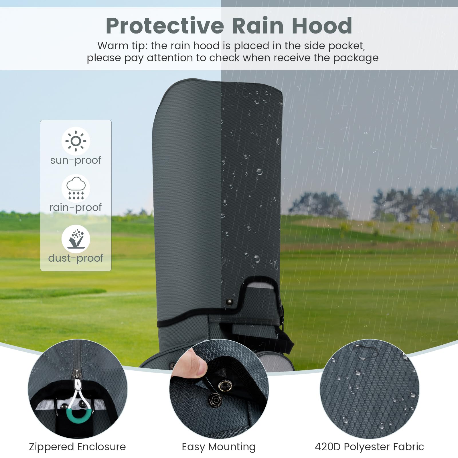 - Protective Rain Hood:?The rain hood is made of rain-proof and sun-proof fabric, and it can protect your golf clubs from sun, rain and dust. Plus, the mounting is easy with buckles, and the zippered enclosure is handy for taking golf clubs. Warm tip: The rain hood is placed in the side pocket, please pay attention to check when you receive the package.