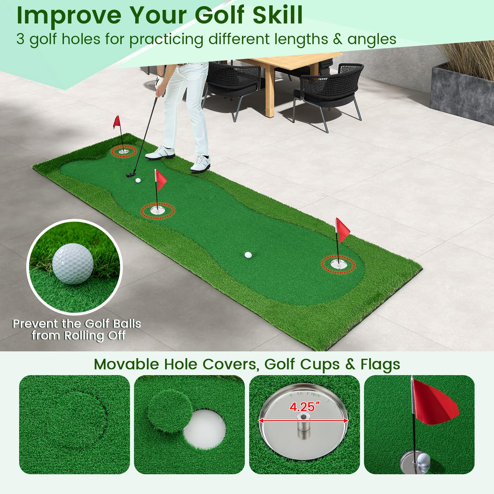 - 3 Holes & Rich Accessories: The golf practice mat is equipped with 3 holes, allowing you to simulate different putting challenges and enhance your accuracy. Besides, 3 flags, 3 cups, 3 hole covers and 2 golf balls are included for better golf practice.