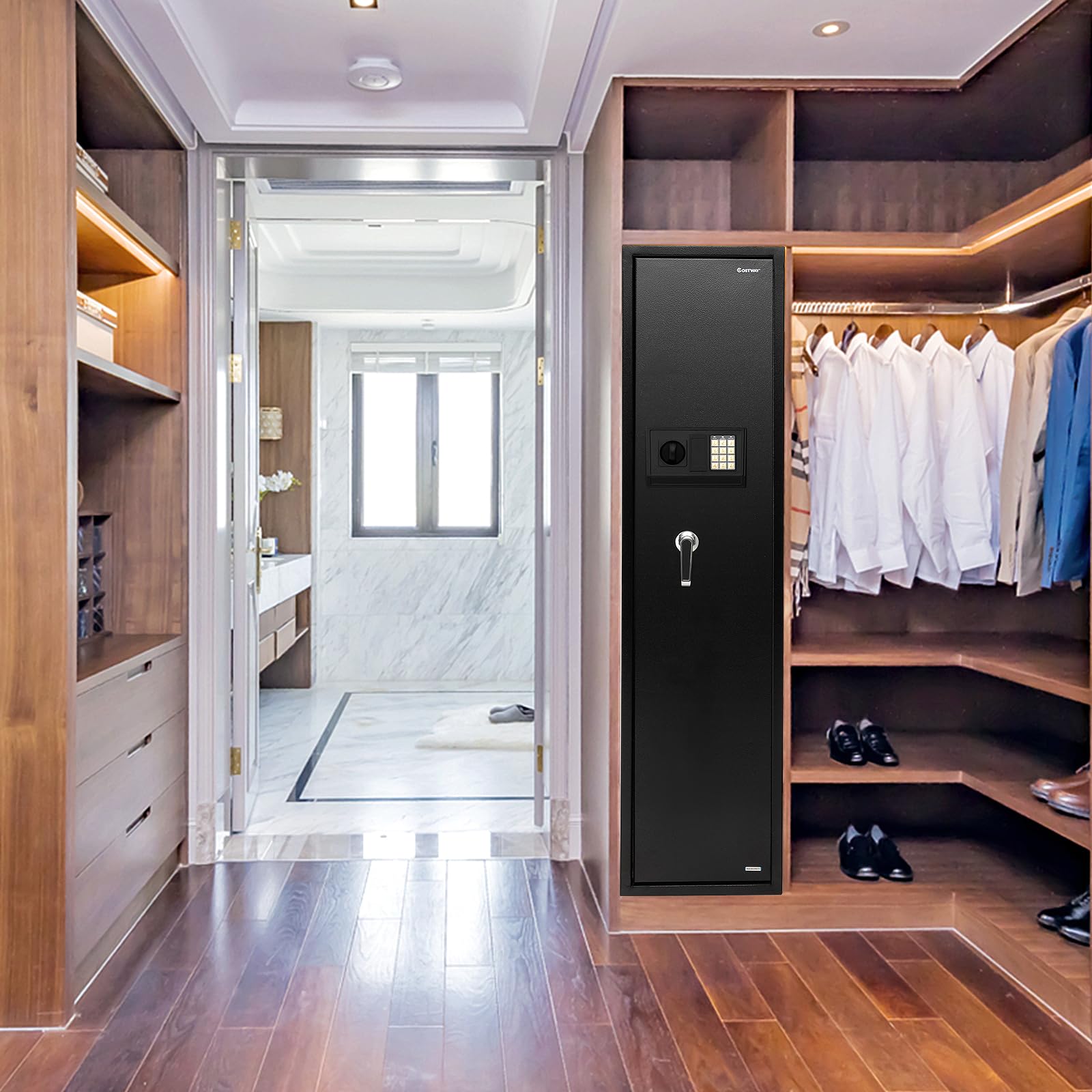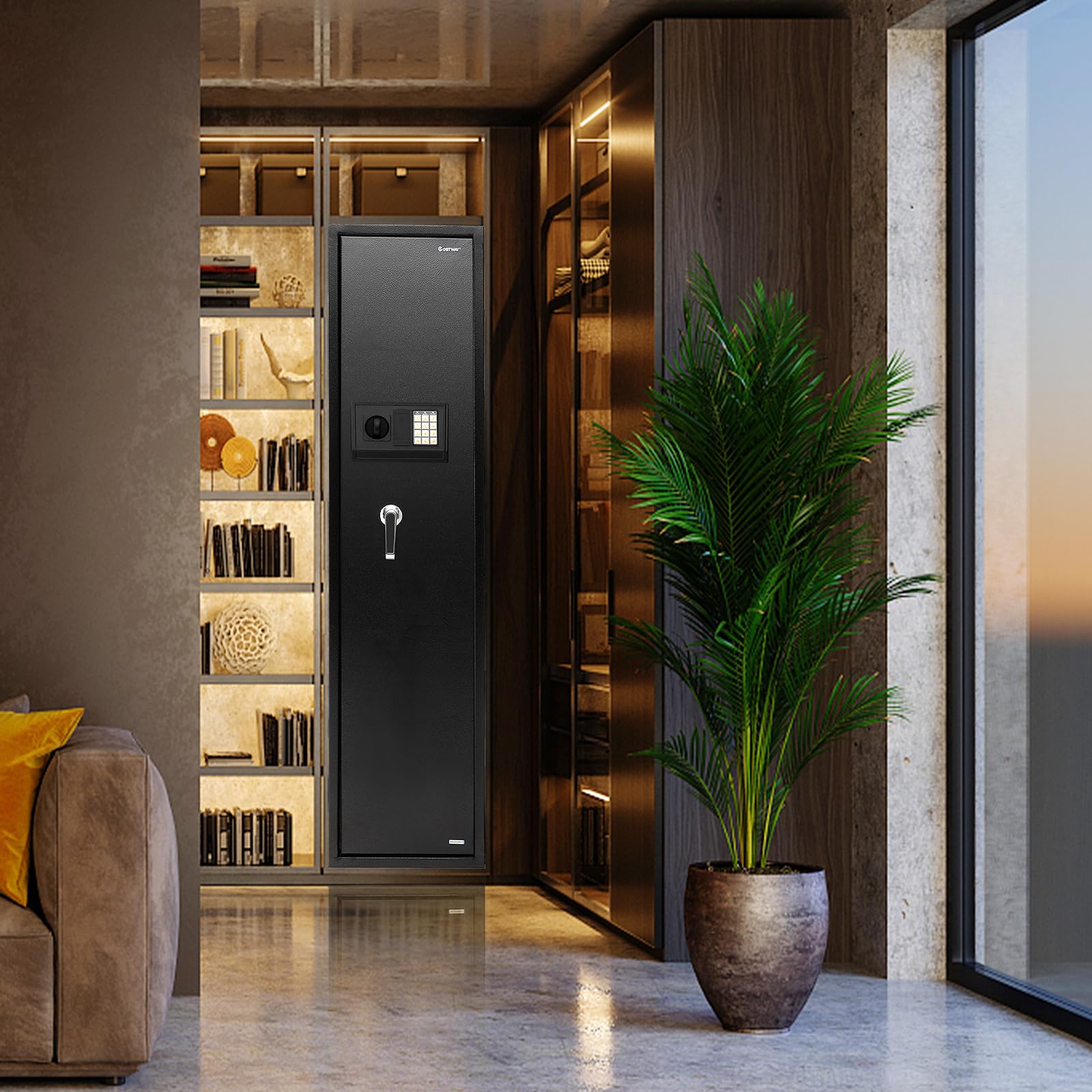 Are you still looking for a safe box for your rifles and valuables? Our large rifle safe is your ideal choice for your home or office. Equipped with multiple methods of fast accessing gun safe, this gun cabinet secures firearms away from kids and effectively prevents unauthorized access. Our gun safe is large and deep enough to store up to 5 rifles. And the lockbox on top helps you store money, handguns and other important items. Made of sturdy and reinforced steel frame, the gun safe ensures long-lasting service time and reliable protection. Besides, its multifunctional and pry-resistant design fit perfectly as a home or office safe box.