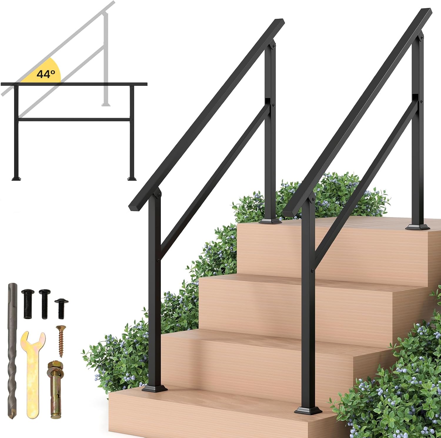 Crafted from superior metal material, this stair railing features a well-coated surface and anti-deformation structure that can support up to 330 lbs. The flexible and adjustable joints ensure the hand rail can adapt to a variety of stair configurations from flat surfaces to those with up to 4 steps. Moreover, the included mounting screws make it fit steps of different materials, such as concrete and brick. Perfect for adding security on decks, porches, or entryways, this exquisitely crafted handrail is an essential addition to any space requiring enhanced safety and mobility. Upgrade your steps today and enjoy newfound confidence with every step.