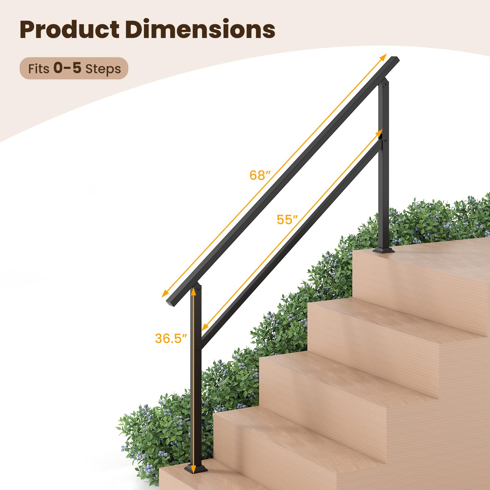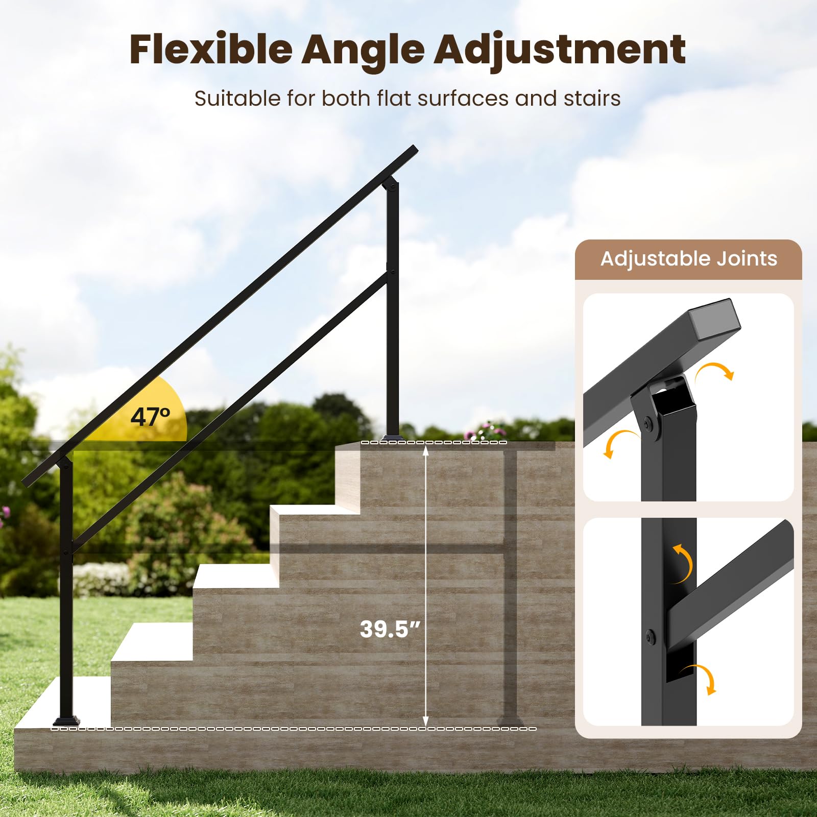 Crafted from superior metal material, this stair railing features a well-coated surface and anti-deformation structure that can support up to 330 lbs. The flexible and adjustable joints ensure the hand rail can adapt to a variety of stair configurations from flat surfaces to those with up to 5 steps. Moreover, the included mounting screws make it fit steps of different materials, such as concrete and brick. Perfect for adding security on decks, porches, or entryways, this exquisitely crafted handrail is an essential addition to any space requiring enhanced safety and mobility. Upgrade your steps today and enjoy newfound confidence with every step.