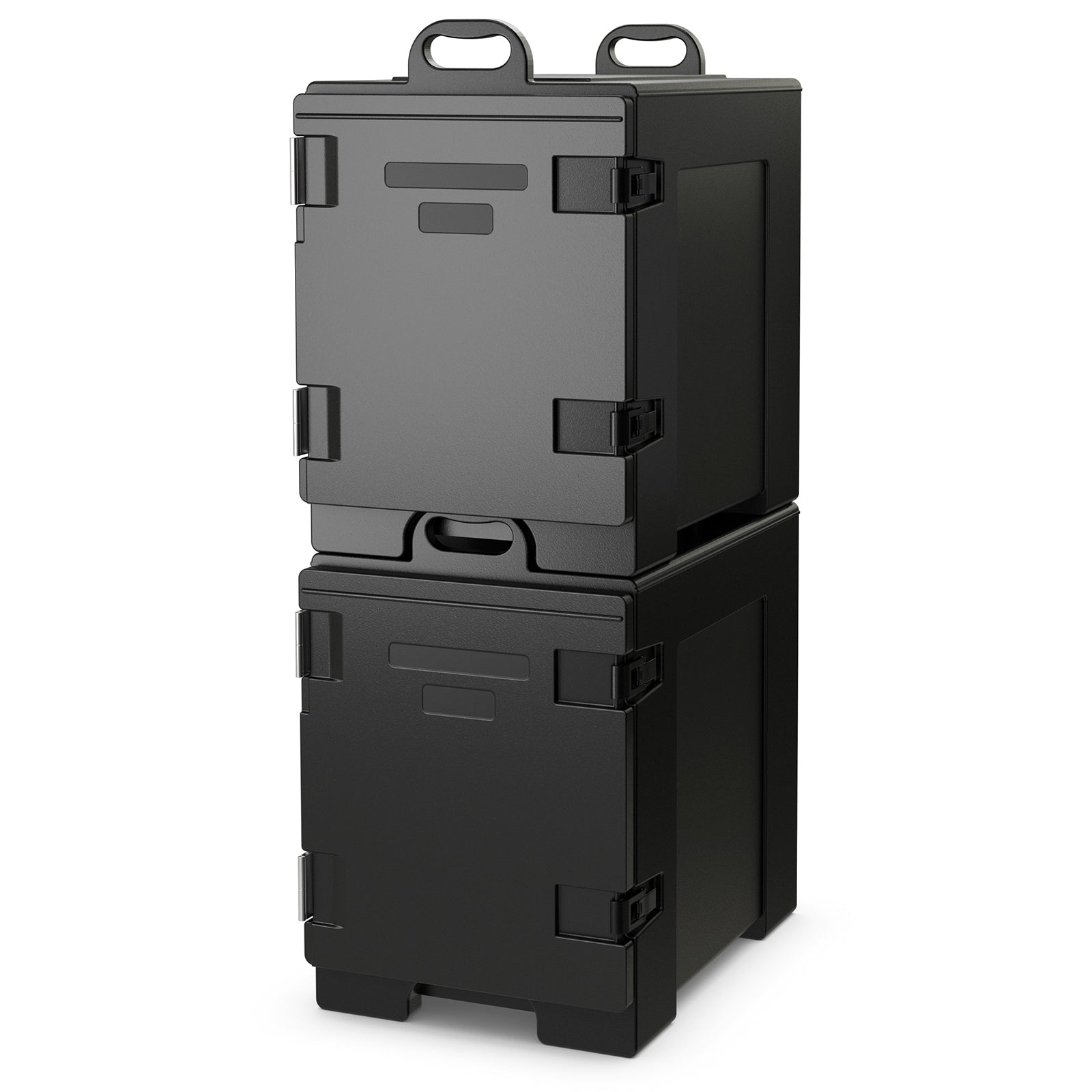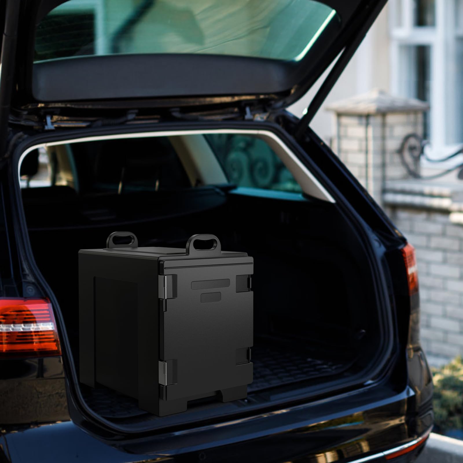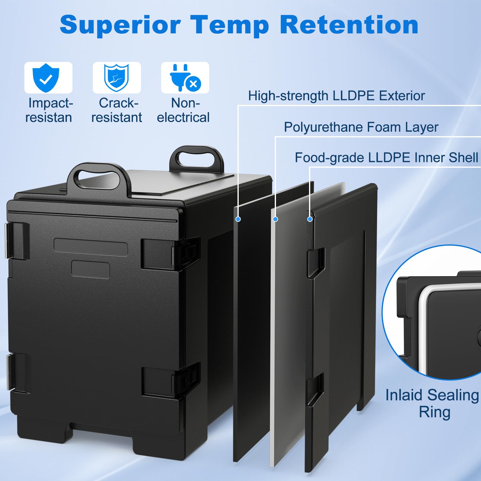 Designed with an 81-quart capacity and 5 included food pans, this premium LLDPE hot box accommodates various items, making it ideal for catering, restaurants, and canteens. Its 270° opening door makes loading and unloading easy. The portable food warmer features a seamless double-wall shell and inlaid sailing ring for excellent sealing, ensuring your food stays hot or cold for 4-6 hours, no electricity needed. The stackable, space-saving design allows for efficient storage, while 2 built-in handles ensure effortless portability.Extra humanized details like stainless steel hinges, nylon latch, and menu slot add convenience. As a bonus, our food carrier comes with stickers for easy marking. Additionally, 2 spare hinges & 2 spare buckles are provided for easy replacements. Perfect for busy kitchens, events, and on-the-go food service needs.