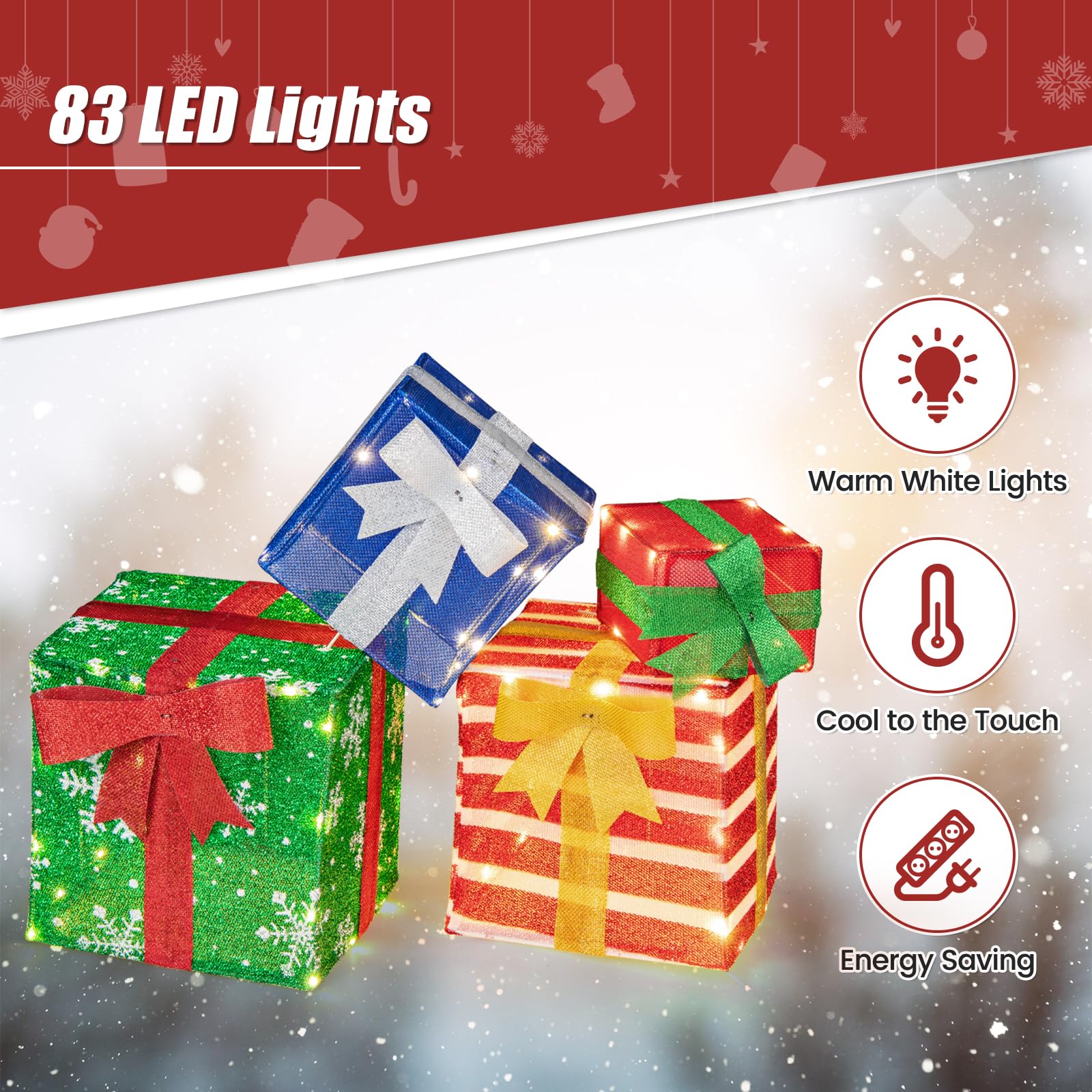 - Pre-lit Brilliance: These decorative gift boxes are pre-lit with a grand total of 83 warm white LED lights. Not only do they emit a cozy glow, but they are also cool to the touch and energy-efficient, providing safety and lasting joy throughout the season, especially for households with young kids.