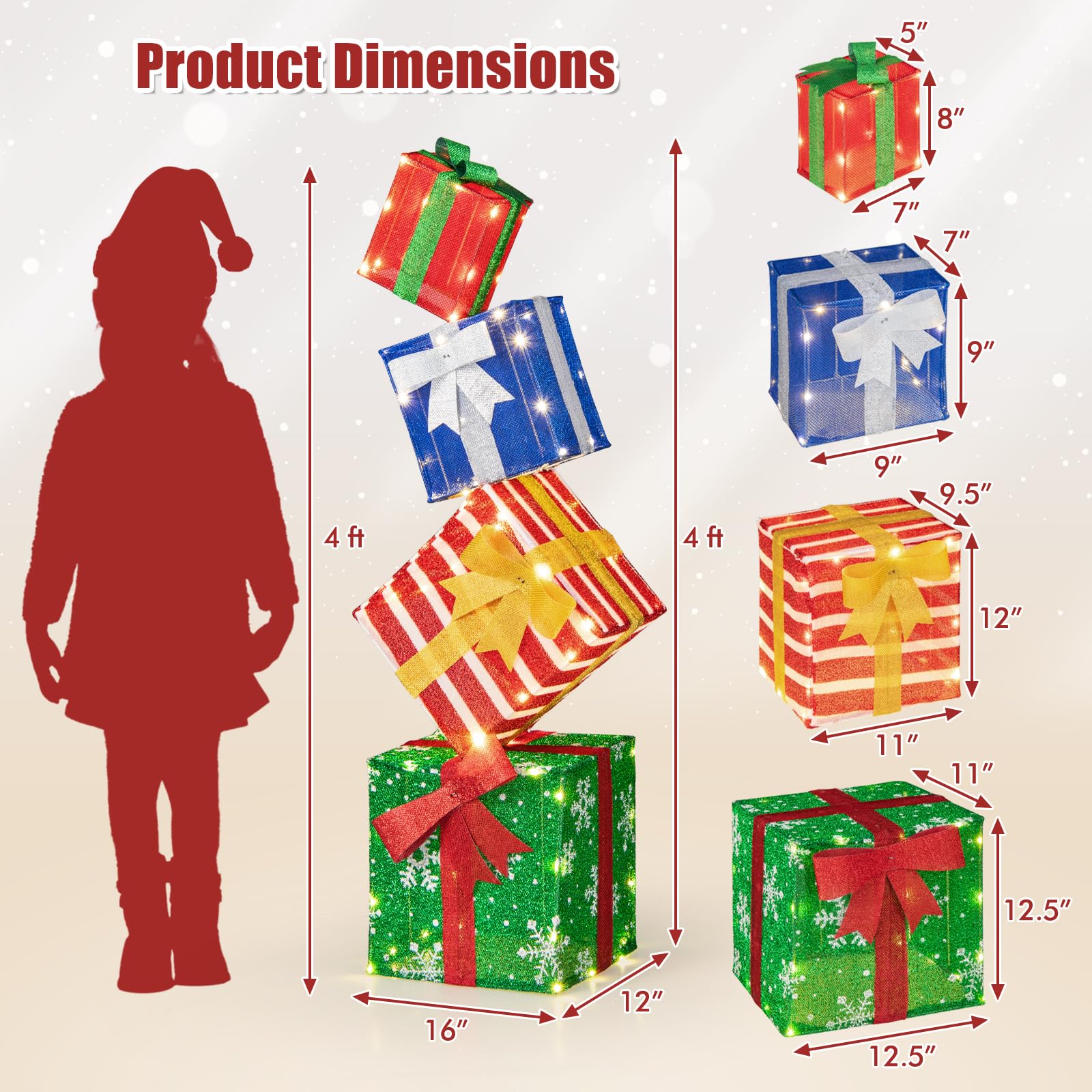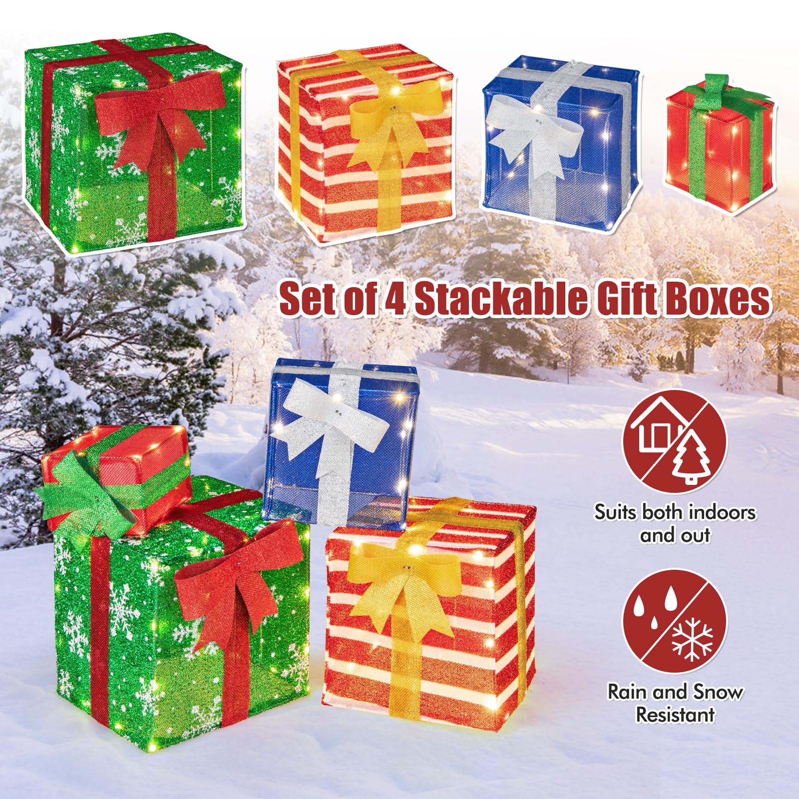 - Versatile Decorations: Delight in our set of 4 stackable gift boxes with different colors and sizes, each adorned with a cute ribbon. Not limited to a specific setting, these versatile gift box lights suits yards, lawns, doorways, and are ideal for decorating the base of your Christmas tree.