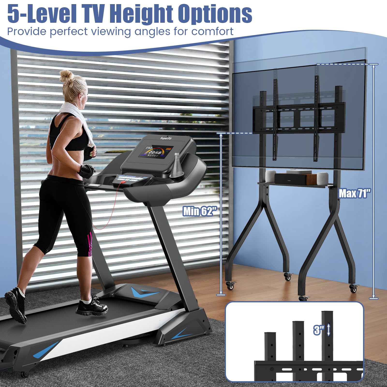 - Adjustable Viewing Height: The rolling TV cart offers 5 height adjustment levels from 62” to 71”, spaced at 3” intervals. Tailor your TV height for an ergonomic setup that meets diverse needs, whether sitting or standing, providing perfect viewing angles for comfort.