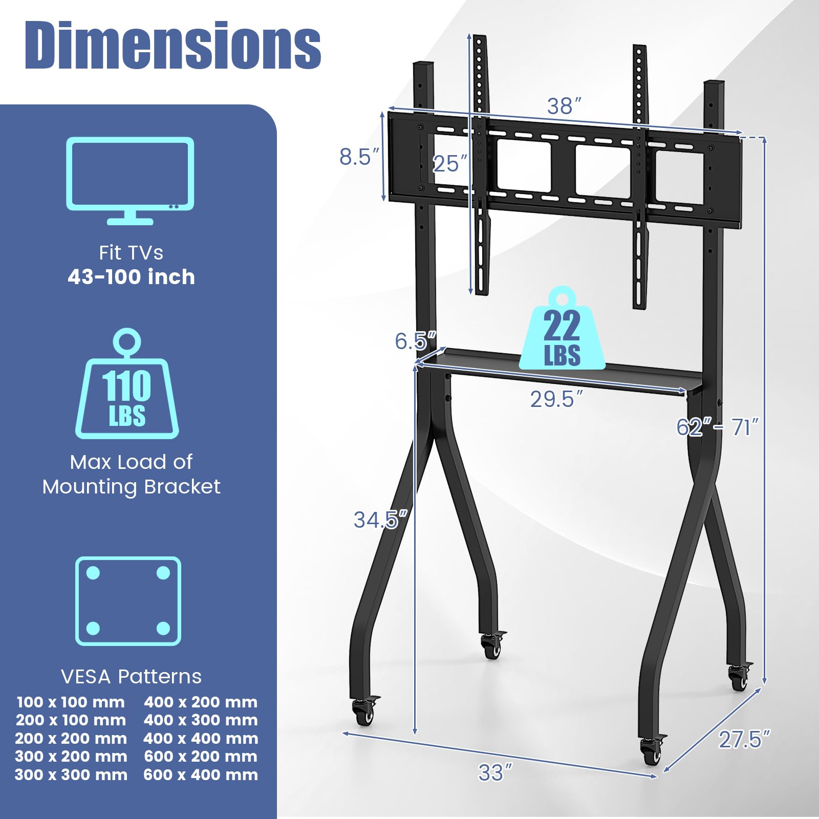 - Universal Compatibility: With an adjustable mounting bracket, our mobile TV stand can support 43”-100” flat or curved screens that weigh up to 110 lbs. It is compatible with VESA patterns from 100 x 100 mm to 600 x 400 mm, ensuring a perfect fit for a wide variety of TVs.