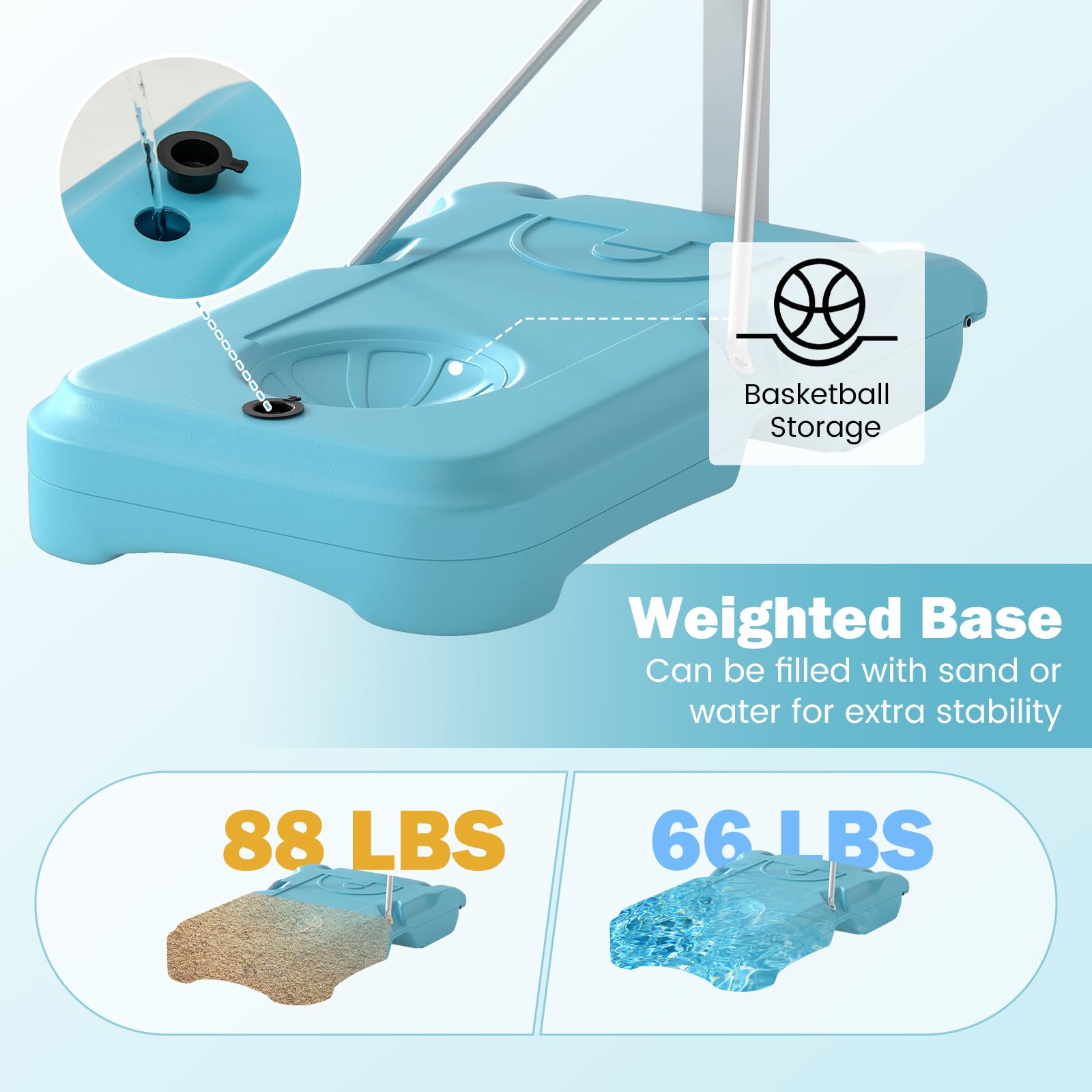 This basketball hoop system is suitable for all ages with its 4-level height adjustment feature. Built to last, it boasts a shatterproof PC backboard, heavy-duty metal rim, and powder-coated metal tubes. The stable weighted base can be filled for extra security and features built-in wheels for easy portability. This basketball hoop can turn your pool into a court, or bring basketball fun anywhere, such as your backyard, driveway, and playroom.