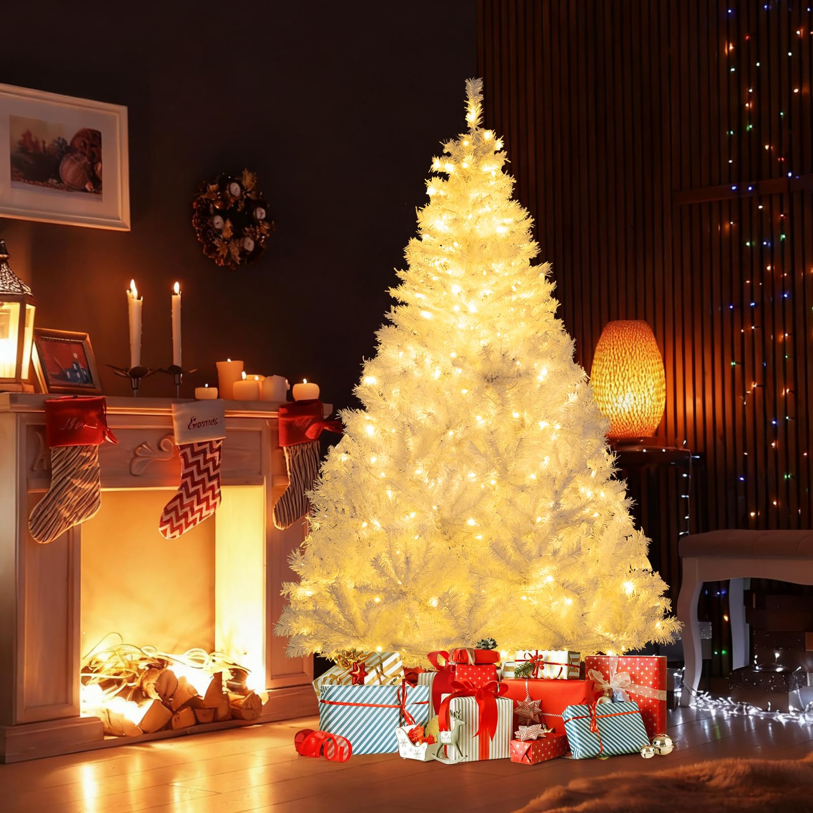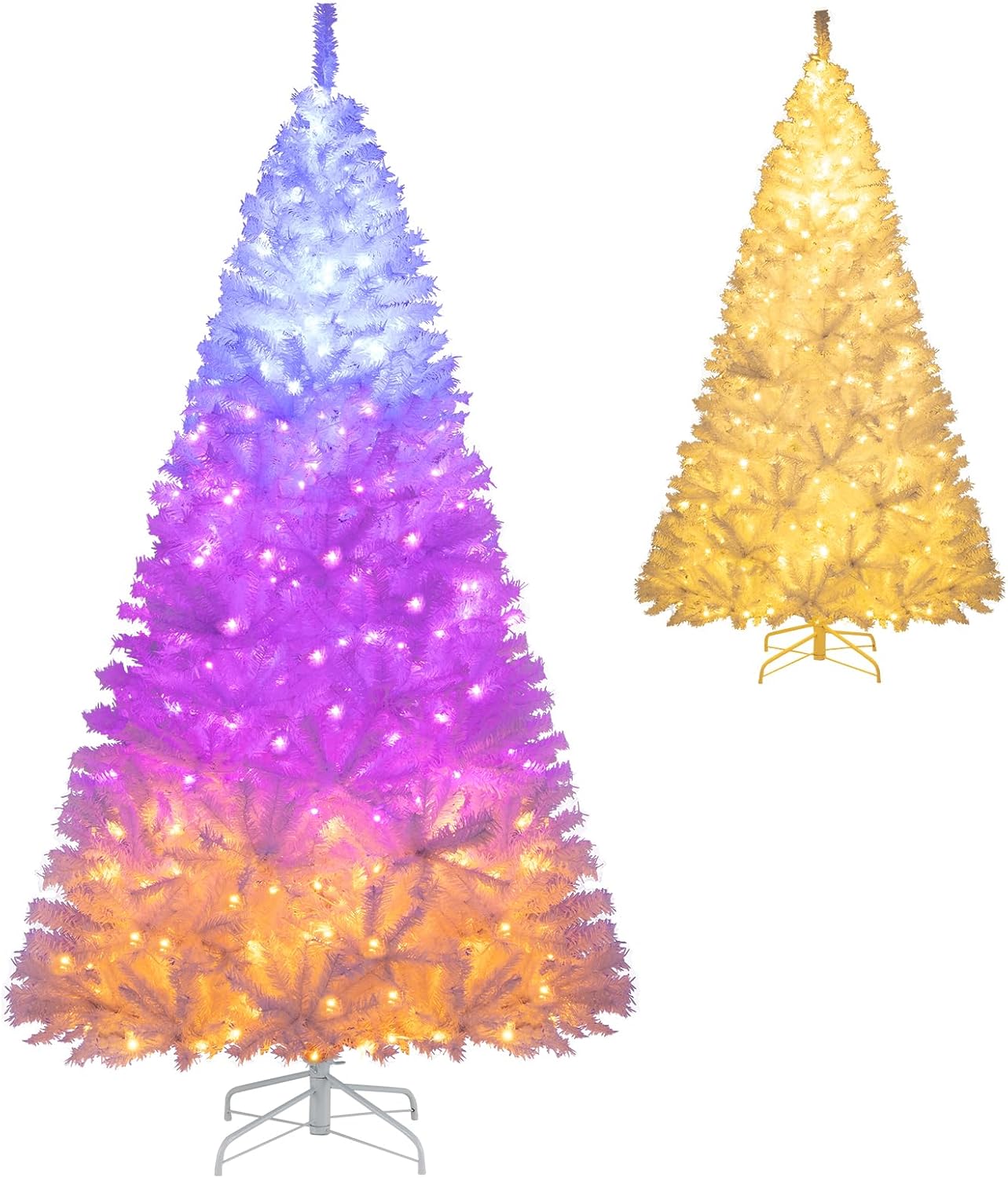 Our 6/7 ft pre-lit artificial Christmas tree boasts 1000/1346 full-bodied branch tips and striking white foliage, providing a lush and sophisticated aesthetic, ideal for a modern holiday decoration theme. Outfitted with 280/400 LED lights, it offers seamless transitions between warm white and multi-color effects, along with 11 unique lighting modes (A steady on, B steady on, A quick flash, B quick flash, A slow flash, B slow flash, A&B colour changing quick flash, A&B colour changing slow flash, A&B colour changing 5 times, A&B colour changing slow fade, A&B steady on) to create a captivating ambiance for any celebration. Crafted from flame-retardant, smell-free PVC leaves and stabilized by a strong crossed metal base, it is designed for safety, durability, and season-long beauty. Assembly is quick and intuitive thanks to flexible hinged branches and a convenient 3-section design, letting you set up or store away the tree with ease. Beyond Christmas, its versatile style and customizable lighting make it the perfect addition for winter weddings, birthdays, photo backdrops, and festive occasions year-round.