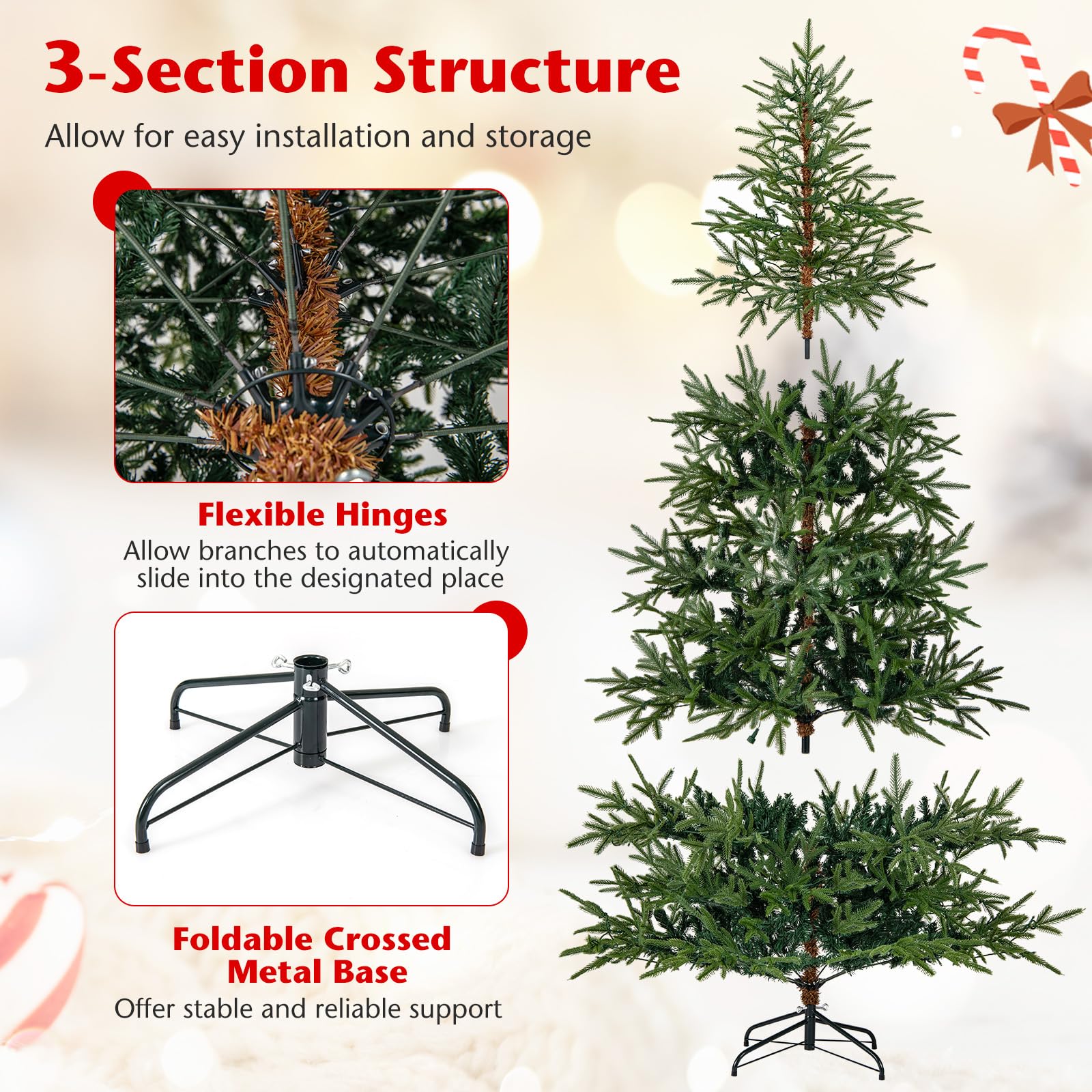 Featuring a unique design with 530/678/890 branch tips that transition from a sparse to a dense configuration, this 6/7/8 ft pre-lit artificial Christmas tree closely resembles the natural grow pattern of a real tree, exuding authenticity. It is made from high-quality, flame-retardant PE leaves for softness and PVC on the trunk for added realism, ensuring durability without compromising on safety. Thanks to the 250/300/400 adjustable LED lights with options for both warm white and multicolored, you can choose from 11 different lighting modes (combination, C1 steady on, C2 steady on, C1 mixture, C2 mixture, slo glo, breathing, C1 slo glo, C2 slo glo, flash, in wave) to create the perfect ambiance. Designed with user-friendly hinged branches and a convenient 3/3/4-section structure, the tree is easy to assemble, disassemble, and store. Plus, the tree is supported by a robust crossed metal base, which keeps it stable and upright all the season. This Christmas tree isn’t just for the festive season; its elegant appearance makes it versatile enough for use in a variety of decorative contexts throughout the year.