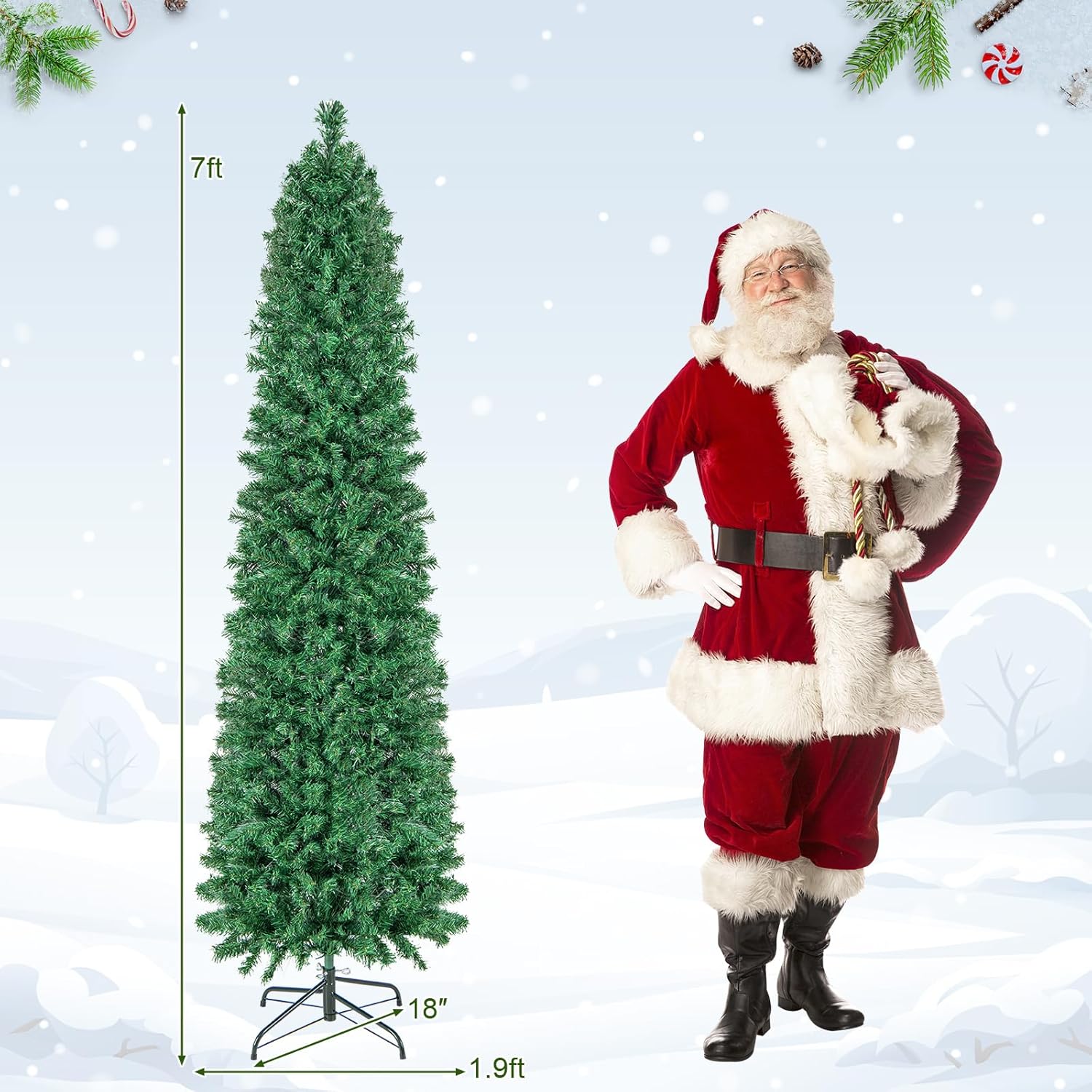This 5/6/7/8 ft stunning Christmas tree is designed with colorful optic fibers that emit a beautiful and mesmerizing light display. It will instantly transform your space into a warm and joyful holiday wonderland. Moreover, designed with 361/517/697/889 lush branch tips, it showcases a realistic and vivid appearance. And the leaves are crafted with high-quality PVC material that is non-flammable, crack-resistant, durable, non-odor, non-allergic, and durable, ensuring long service life. The cross-shaped metal base provides great support and ensures balance, keeping the tree upright and preventing breakage. Other than that, with its space-saving pencil shape design, the Xmas tree is ideal for small spaces or those looking for a contemporary and minimalist holiday display!