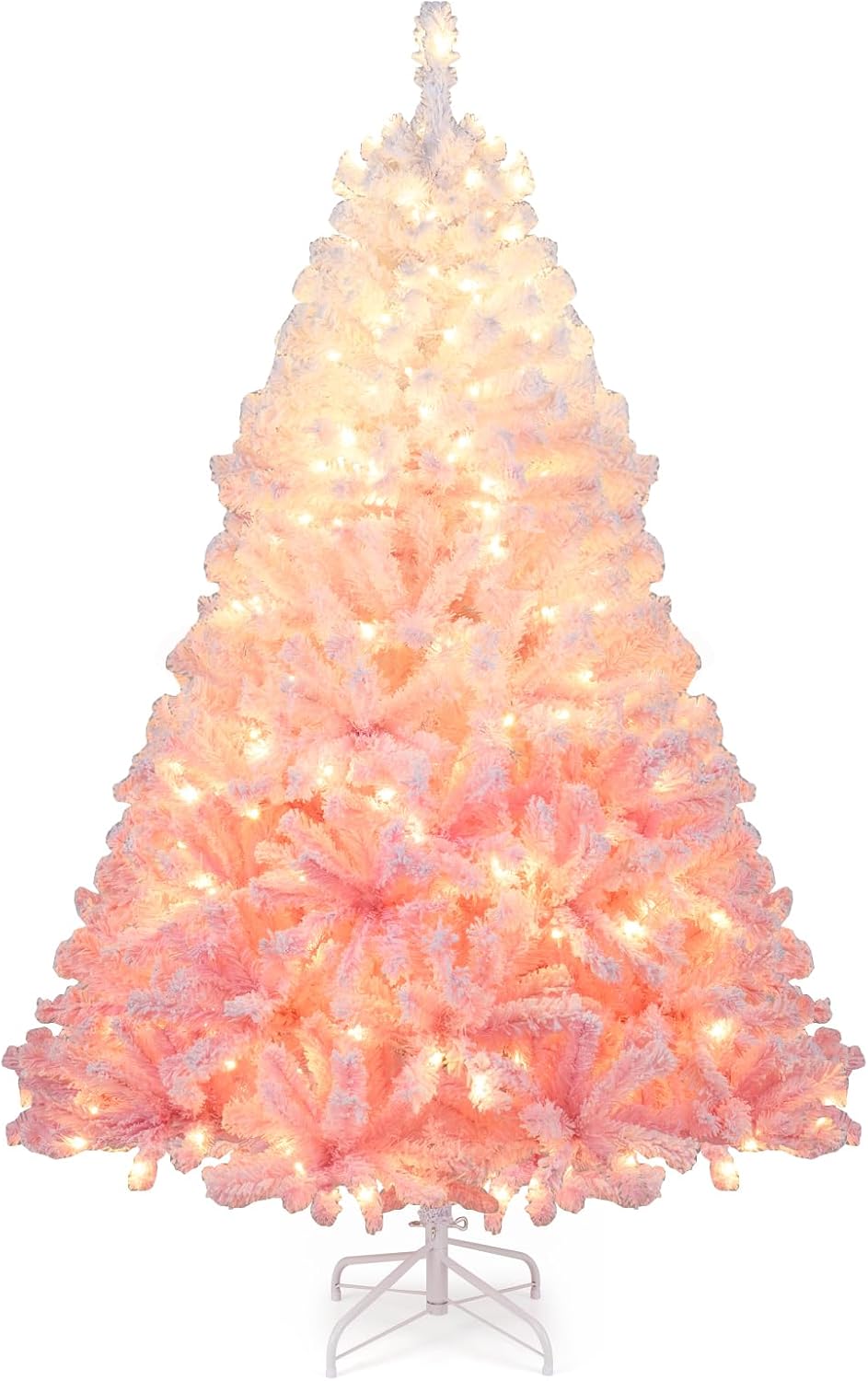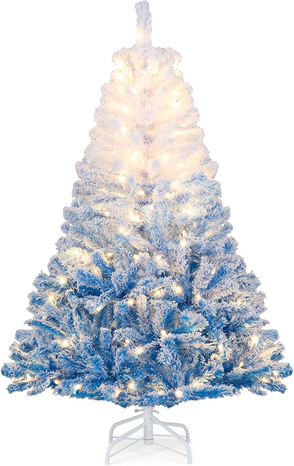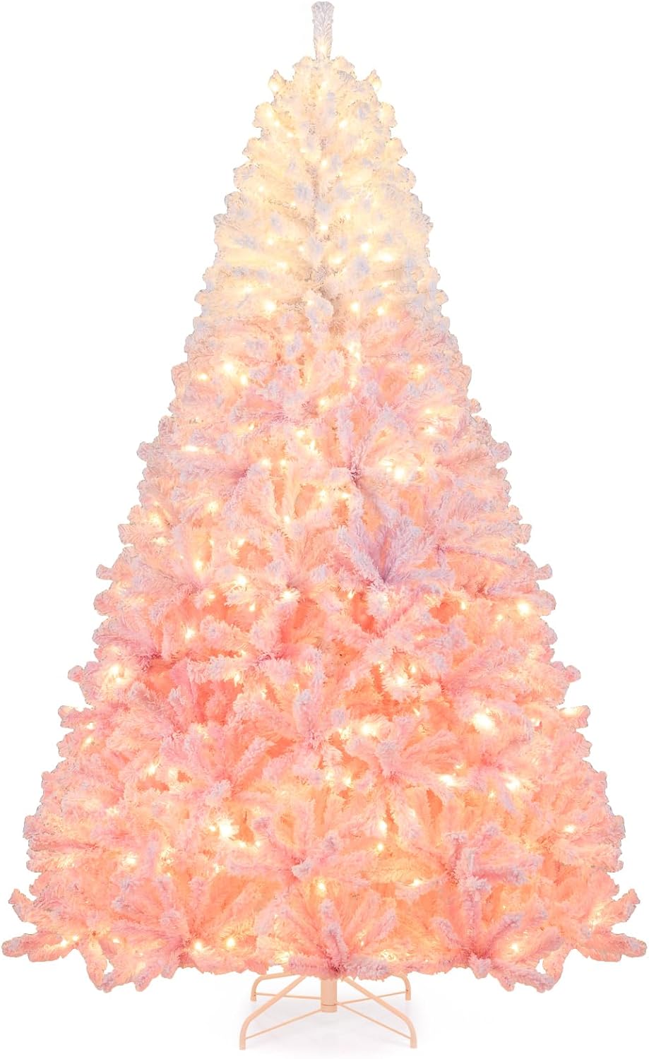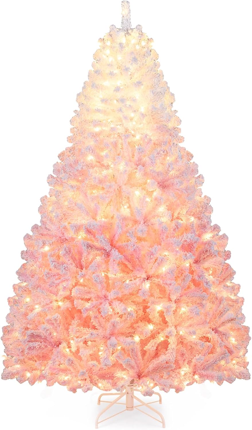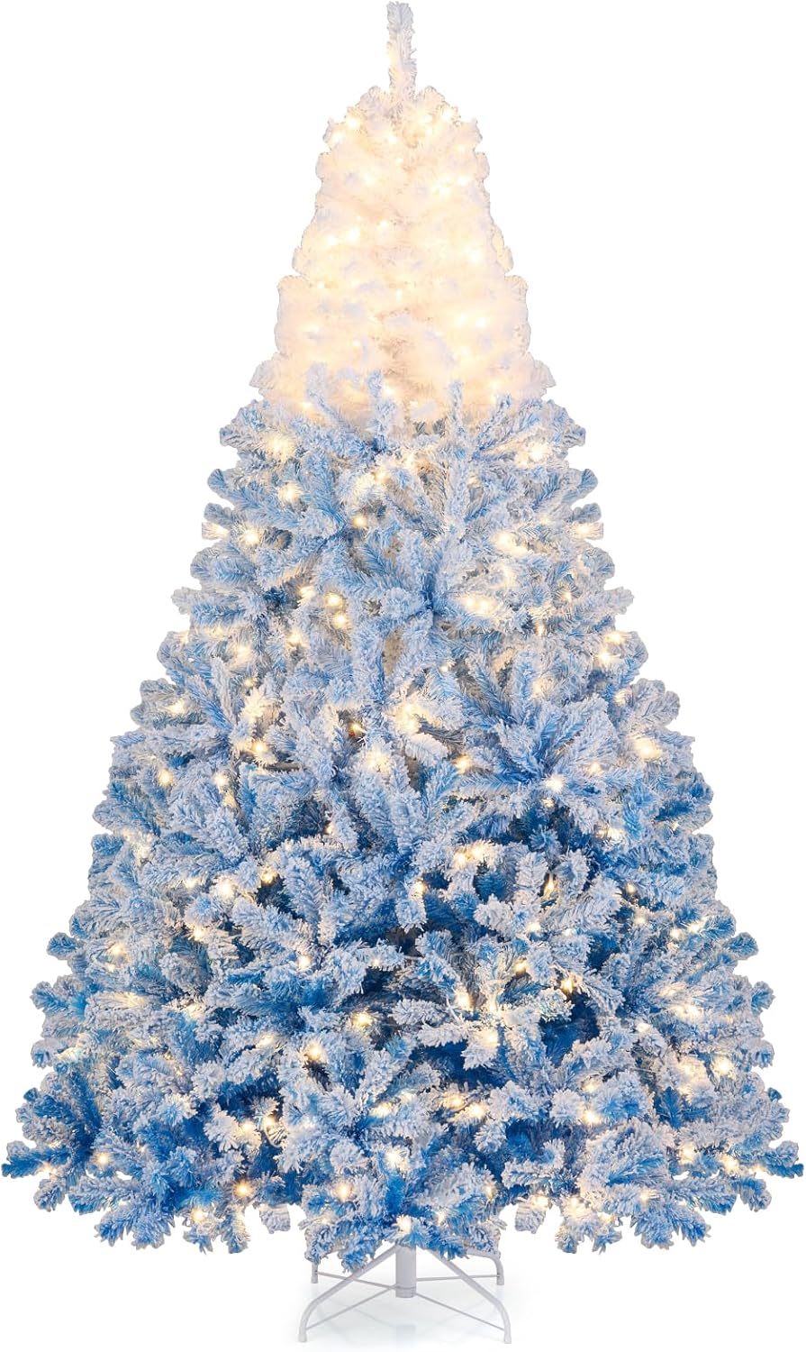 Our 5/6/7/8 ft artificial Christmas tree boasts a unique gradient color of white to pink/white to blue. It features a dense array of 456/820/1264/1774 lush branch tips, covered in thick snow flocking to emulate a genuine wintry feel right in your home or office. Crafted from 100% new PVC, the flame-retardant and fade-resistant materials ensure the tree’s longevity and safety. Its pre-strung 180/250/350/470 warm white LED lights offer a soft, festive glow, while 8 adjustable lighting modes (combination, in wave, sequential, slo glo, chasing/flash, slow fade, twinkle/flash, steady on) make it easy to create just the right mood for family gatherings or festive occasions. Assembly is a breeze thanks to the flexible hinge design that allows branches to effortlessly fall into place and the 2/3/3/4-section structure, paired with a foldable crossed metal base, offering stable and reliable support, including foot pads for floor protection. This tree not only simplifies the traditional hassles of assembly and storage but also serves as a versatile centerpiece suitable for a variety of indoor celebrations beyond Christmas. (Note: The decorations are not included)