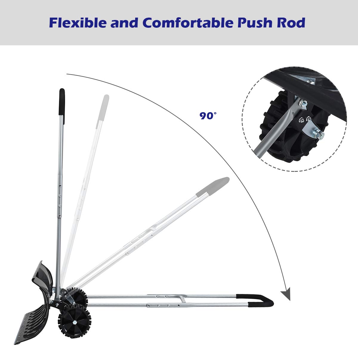 Goplus Rolling Snow Pusher Shovel, Handle Adjustable Snow Removal Tool, Manual Push Plow with 6-inch Wheels for Walkways
