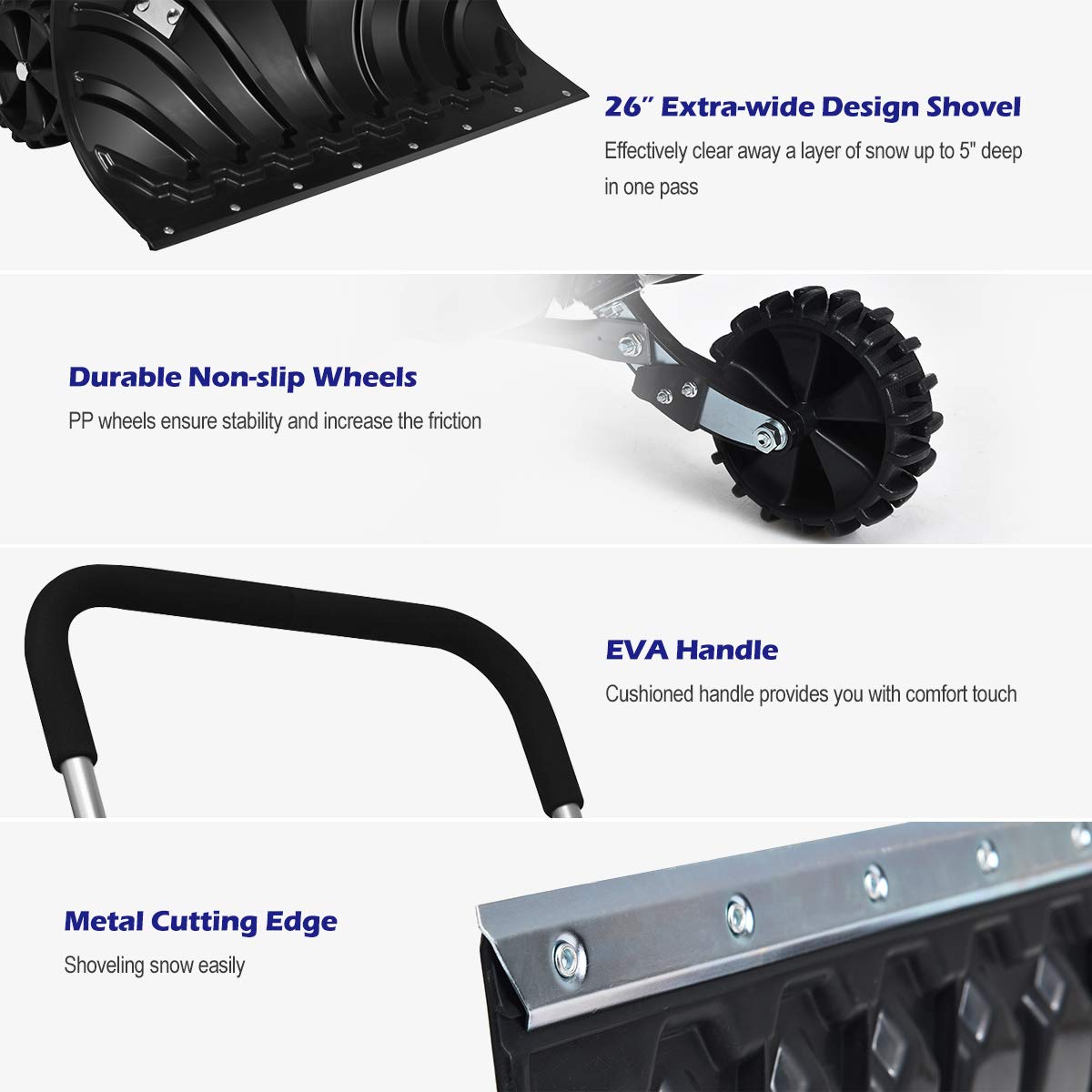 Effective Snow Removing The wheeled snow pusher is equipped with a large shovel plate size of 26" x 12.5" (L... Read more