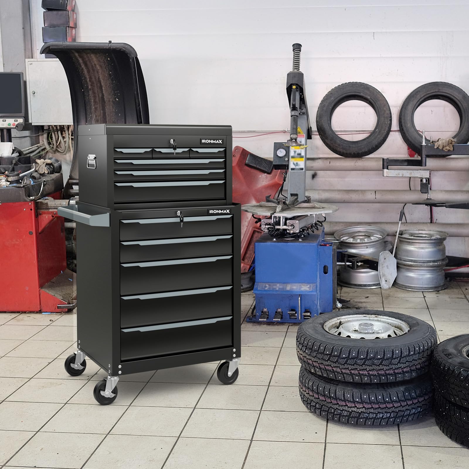 The steel tool chest is a versatile storage choice that offers a practical 11-drawer design for easy tool organization. With ball-bearing slides and a sturdy steel structure, it can support up to 329 lbs. The tool box includes a platform for assembly tasks and pre-drilled holes for tool hook installation. To safeguard tools, it comes with EVA liners and features a central locking system for security. Transporting the toolbox is simple with its pushing handle and 360° universal wheels, including 2 lockable ones for stability in place. Ideal for repair shops, garages, warehouses, and various workspaces, this tool cabinet combines functionality and premium details for efficient tool storage.