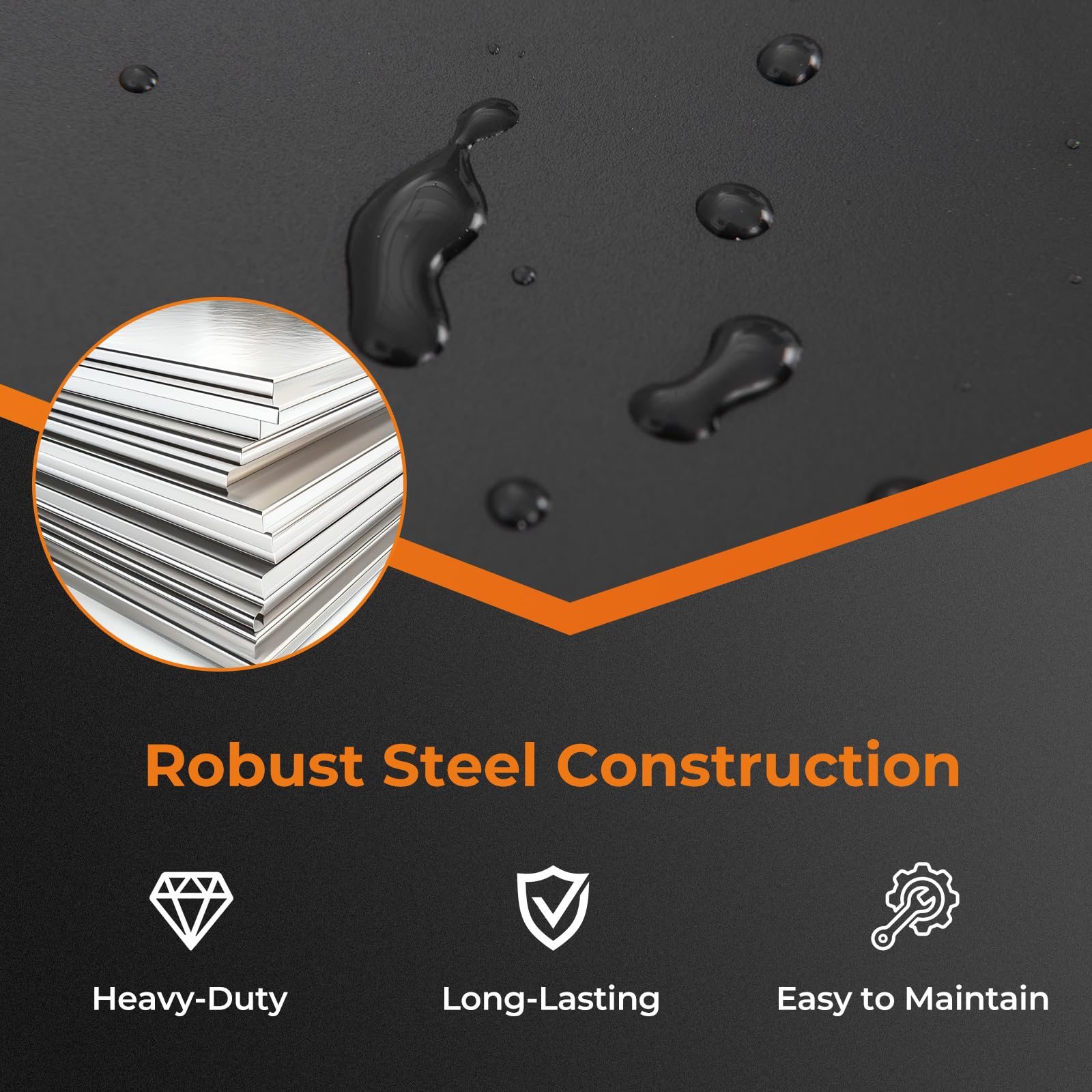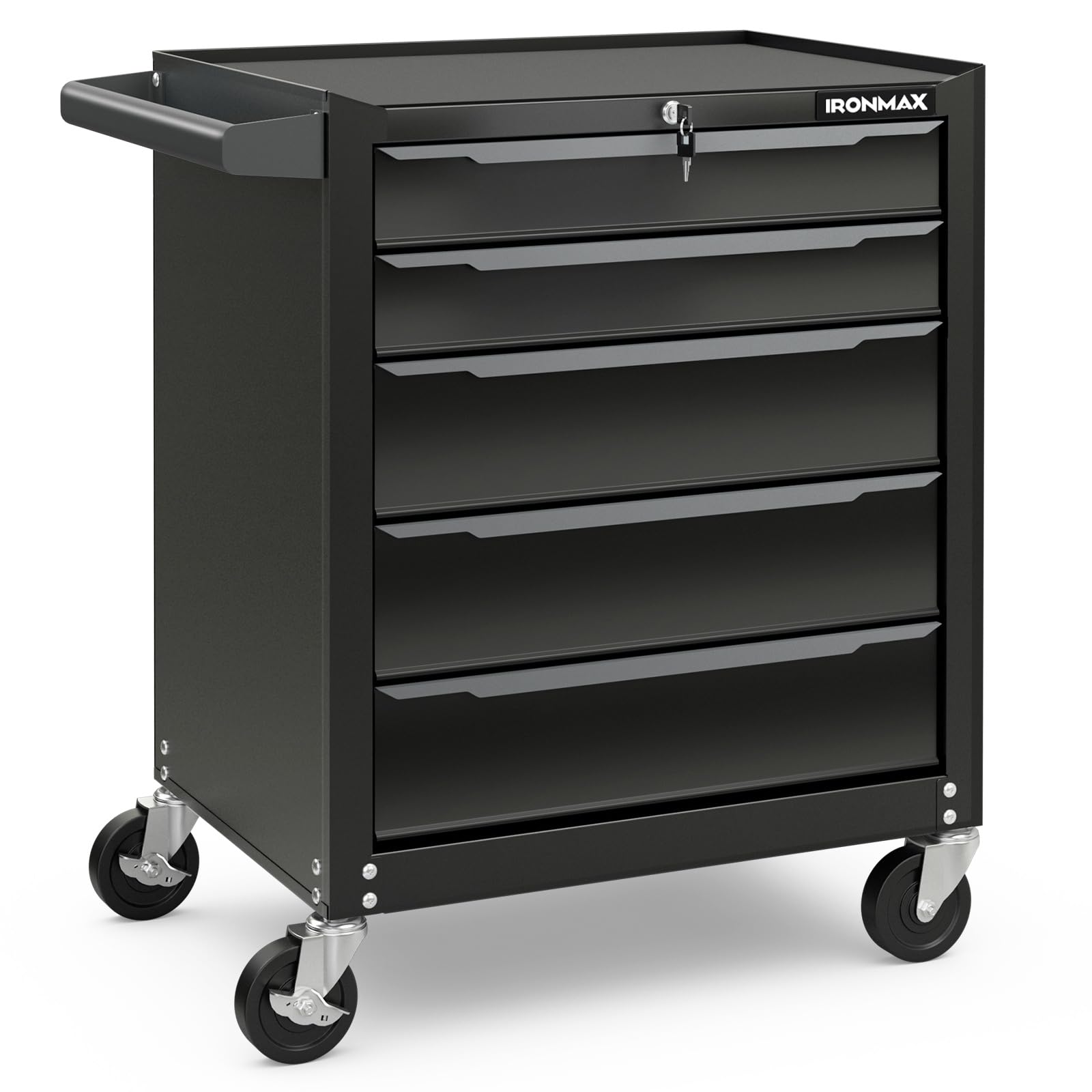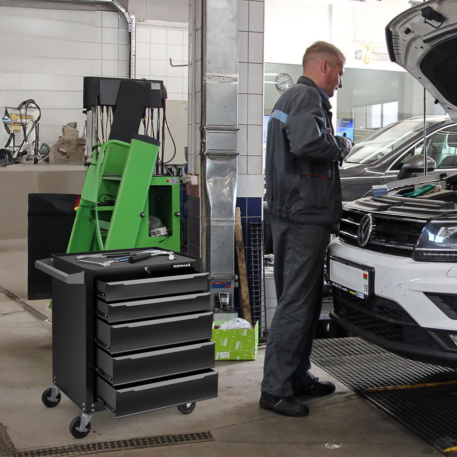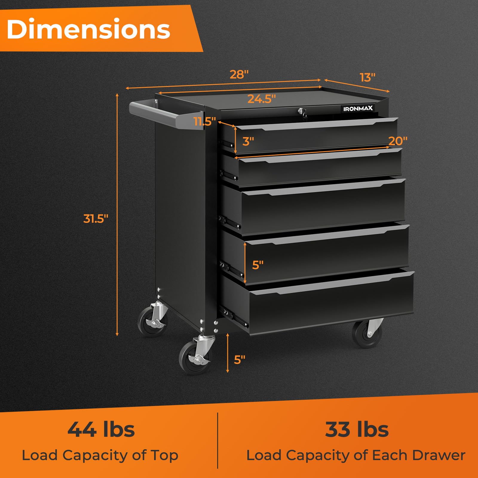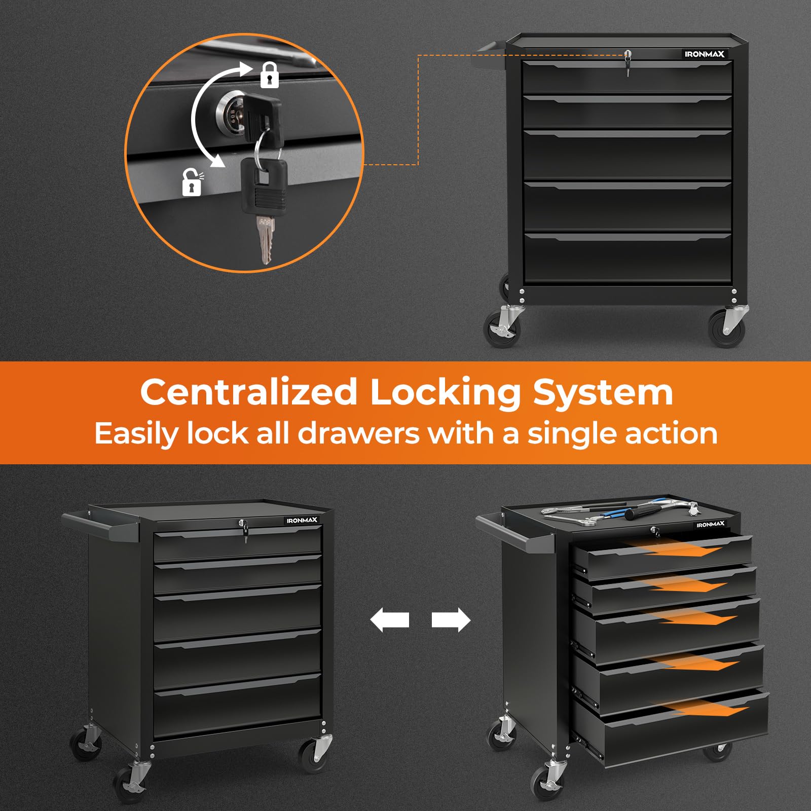 The steel tool chest is a versatile storage choice that offers a practical 5-drawer design for easy tool organization. With ball-bearing slides and a sturdy steel structure, it can support up to 209 lbs. The tool box includes a top platform for assembly tasks and pre-drilled holes for tool hook installation. To safeguard tools, it comes with EVA liners and features a central locking system for security. Transporting the toolbox is simple with its pushing handle and 360° universal wheels, including 2 lockable ones for stability in place. Ideal for repair shops, garages, warehouses, and various workspaces, this tool cabinet combines functionality and premium details for efficient tool storage.