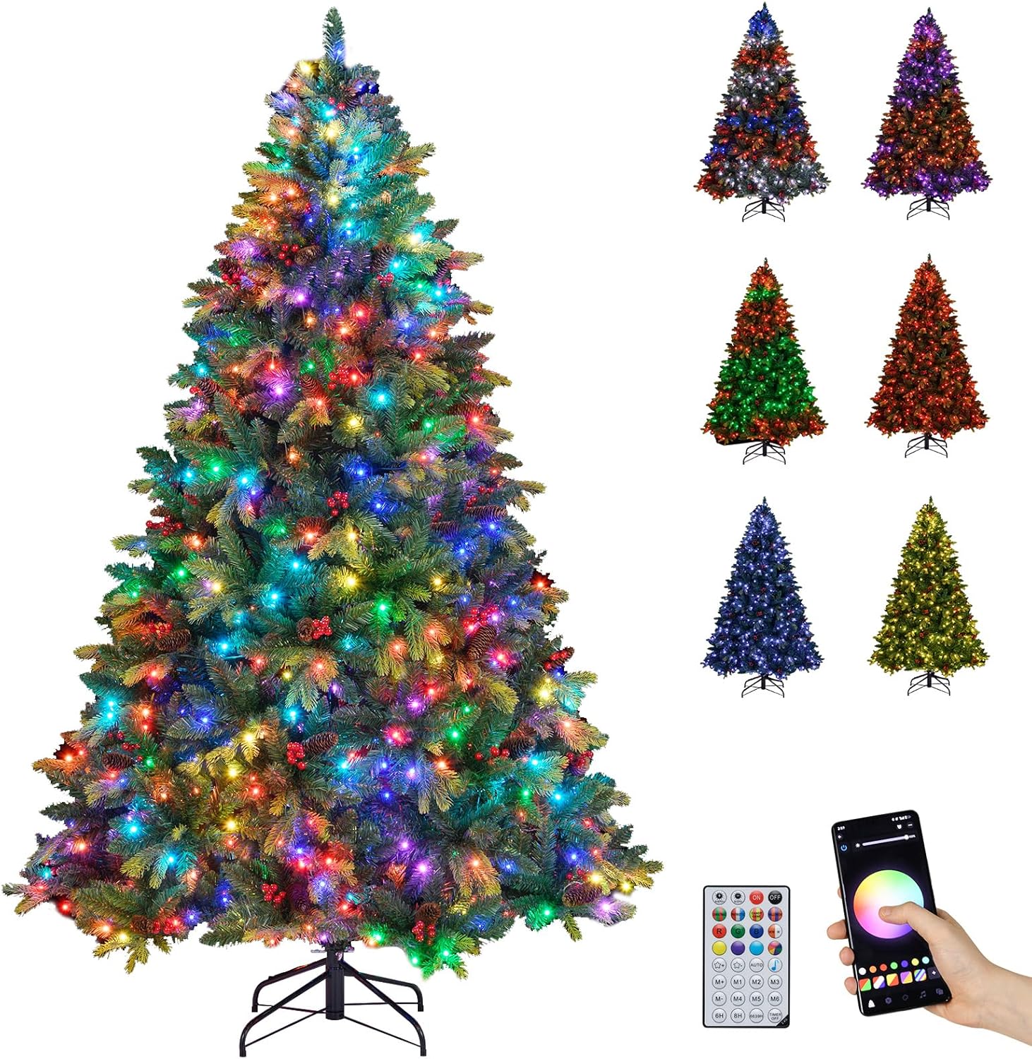 Our 5/6/7/8 ft pre-lit artificial Christmas tree dazzles 250/370/500/650 customizable RGB lights, with DIY lighting and APP control, offering millions of brilliant color possibilities and multiple lighting effects, such as 4 unique seasonal palettes: Christmas/Patriotic/Candy Cane/Halloween, random multicolored distributions, switching between warm white and cool white, Auto-rotating through dynamic effects. Particularly, it includes music rhythm modes that sync your light display with the beat of the season with 5 dynamic modes. Lights are easy to control by a mobile APP via wireless connection, paired with a remote control for convenience. Other than that, its premium foliage features nearly 584/1054/1436/1936 branch tips with assorted textures and color tones, accented by natural pine cones and bright red berry clusters for a captivating, upscale appearance. The foldable crossed metal base ensures solid support, while flexible hinged branches and a 2/3/3/4-section structure make assembly and storage refreshingly simple. Designed to stand out in living rooms, offices, lobbies, or festive venues, this Christmas tree delivers both sophistication and convenience for a truly memorable holiday season.