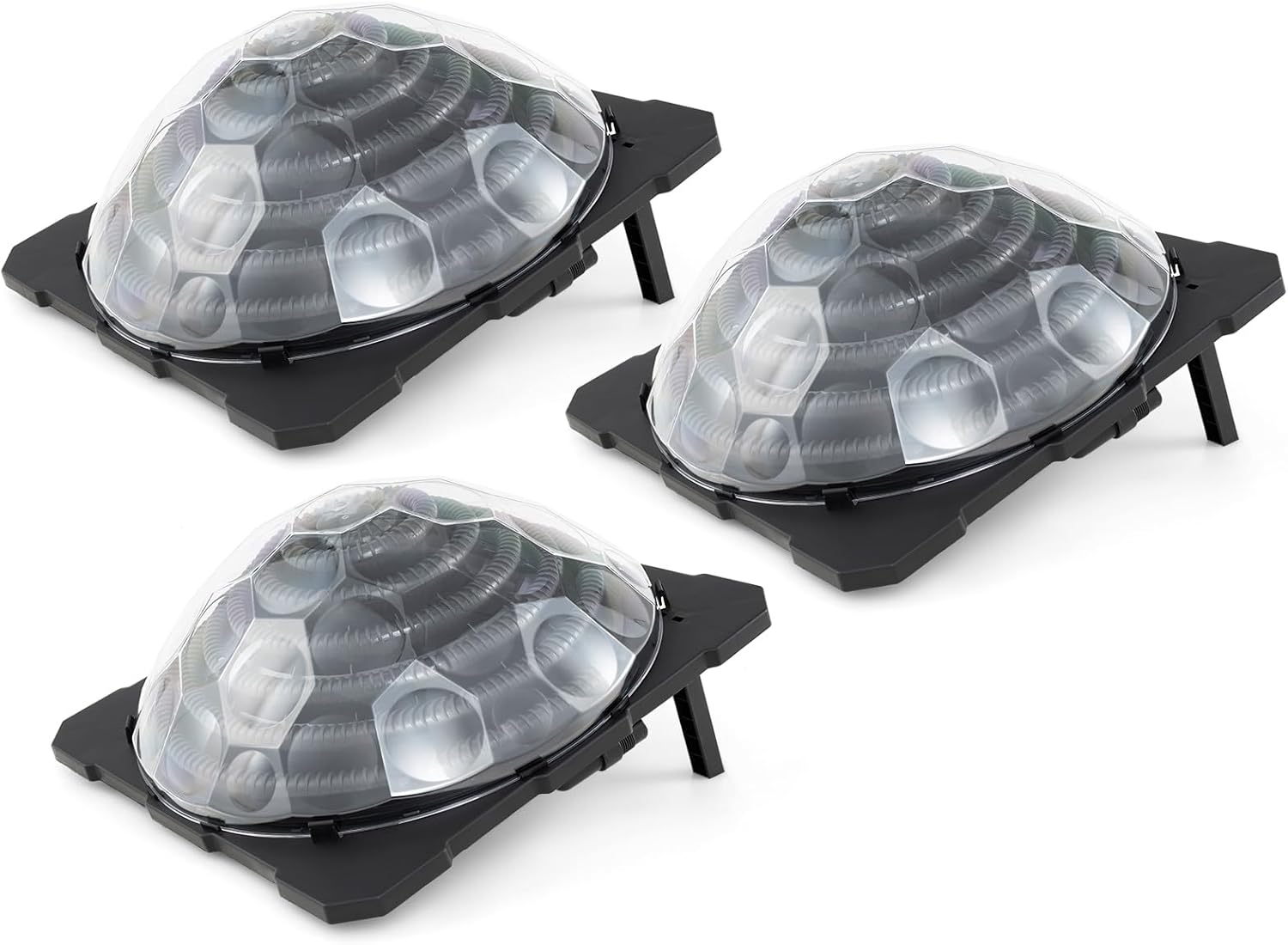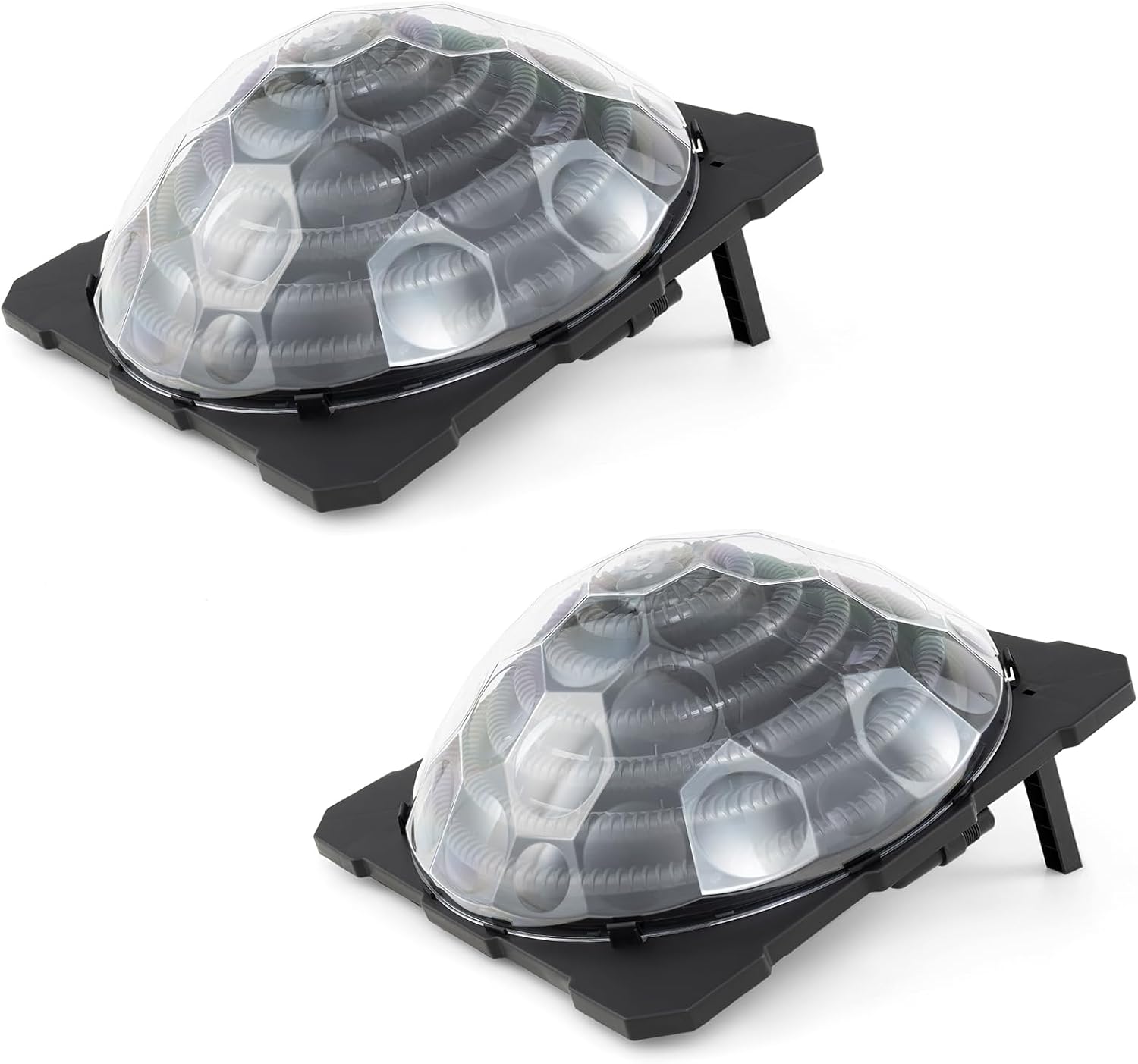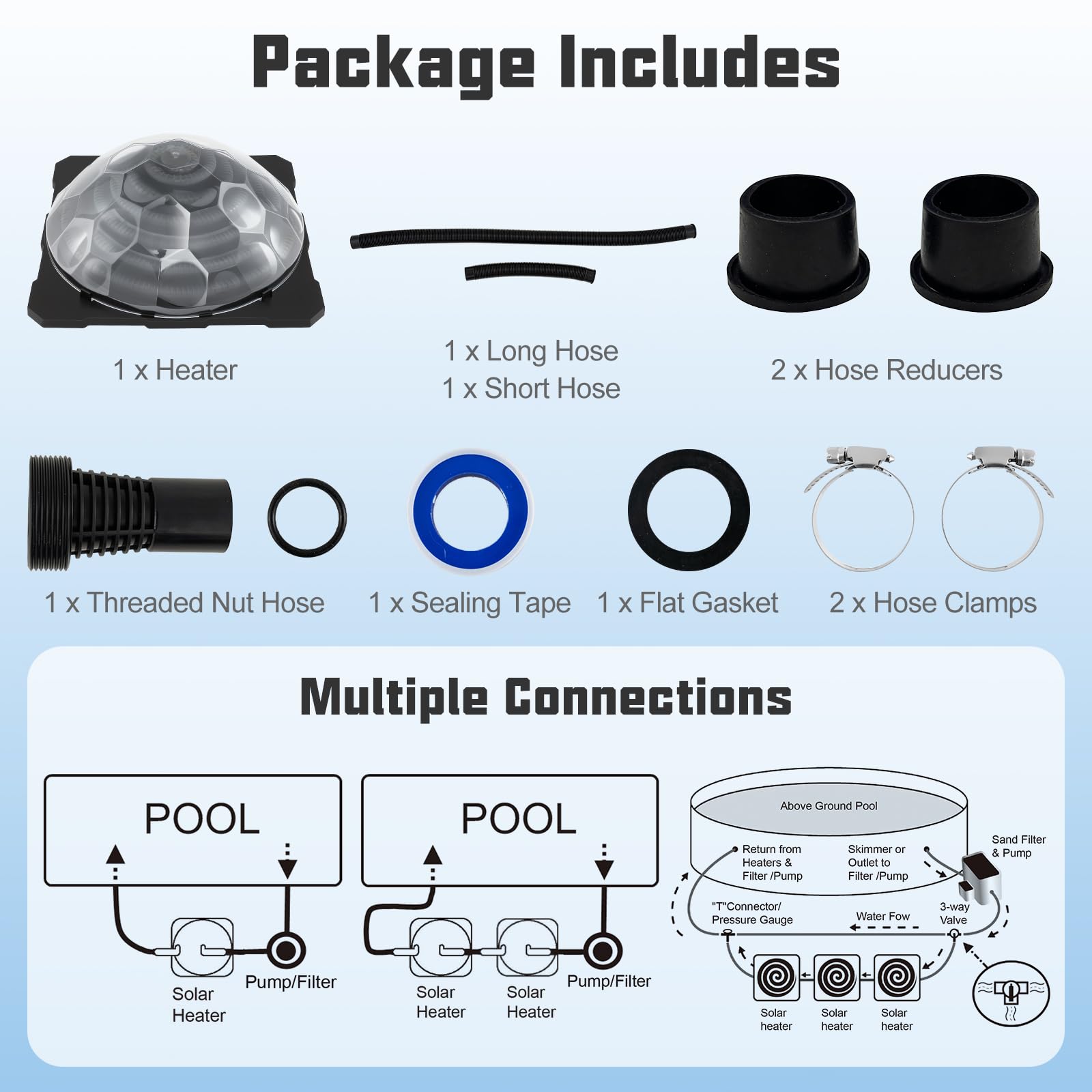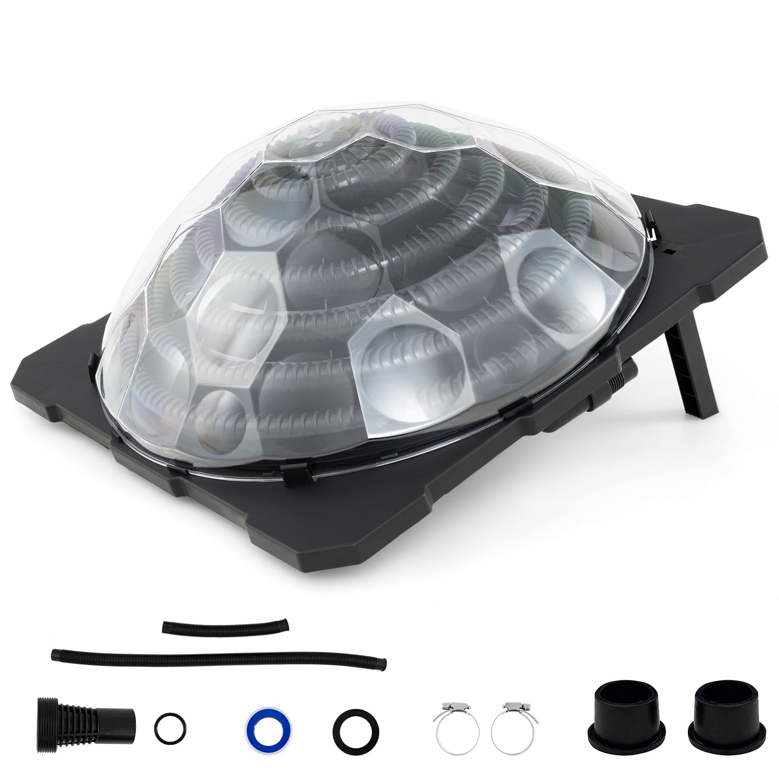 This pool warmer captures sunlight efficiently through the black coil and transparent dome cover, elevating your pool's temperature by 5.4-7.2℉. Setup is a breeze with the included installation kit: 1 flat gasket, 1 threaded nut hose, 1 sealing tape, 1 short hose, 1 long hose, 2 hose clamps and 2 hose reducers. Flexible installation options are provided by 90° rotatable hose connectors, allowing for connection of up to 3 heaters for larger pools, best paired with a 1-2HP power pump (not included) for optimal flow. Plus, the smart design features foldable and wider legs for easy angle adjustment and compact storage, enhancing stability and convenience.