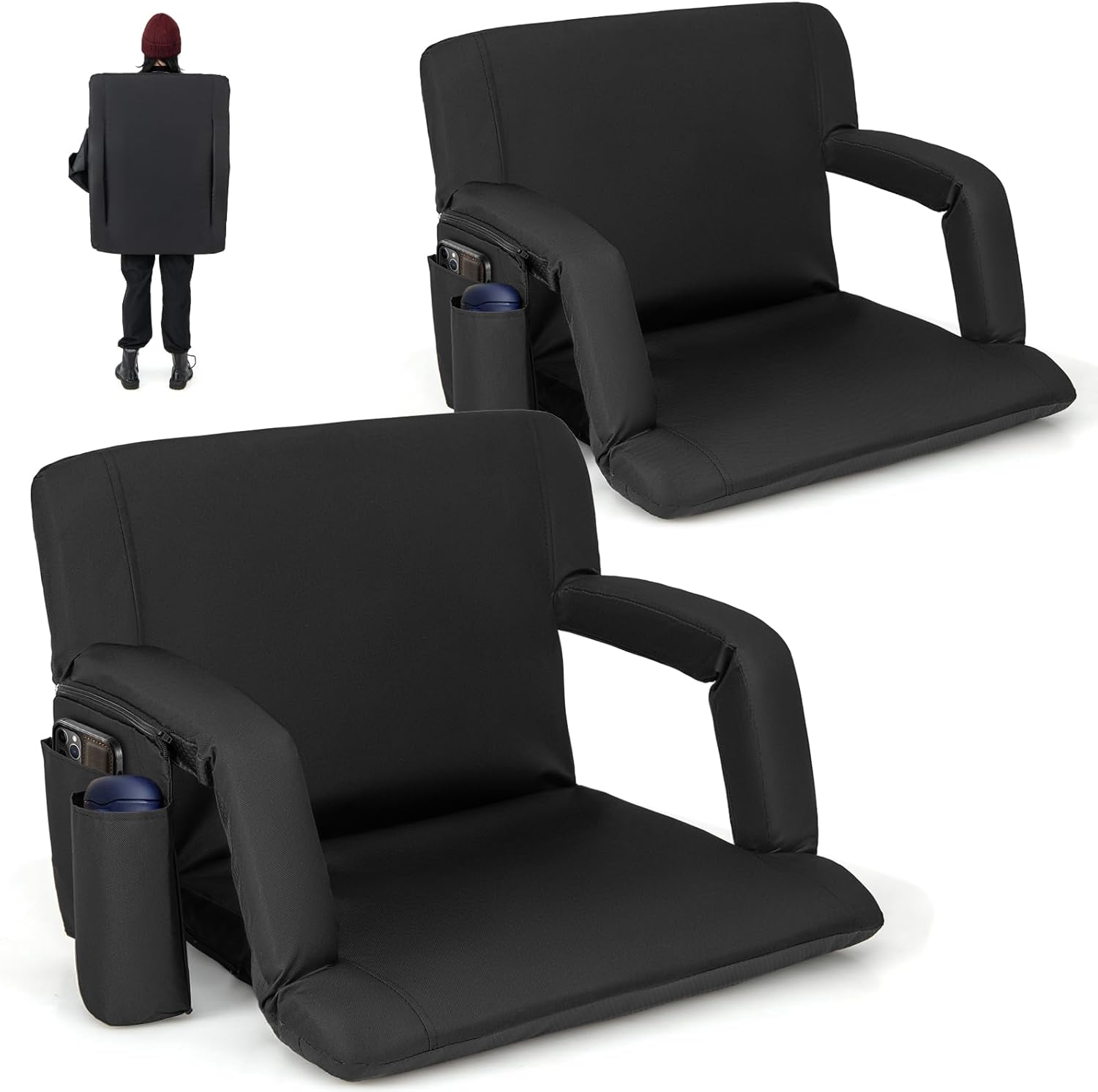 Portable bleacher seat that accompanies you to every outdoor activity!br>Have the hard outdoor seats ever ruined the fun of watching the game? Our bleacher chair is filled with 3 layers of foam to provide a comfortable sitting experience. In addition, the armrests and high backrest will offer you unparalleled comfort. And the backrest has 6 adjustable positions, so you can easily choose the best viewing position. What's more, there is a cup holder on the side of the seat to prevent you from getting thirsty, while the storage pocket behind the backrest is convenient for you to carry some necessary supplies. Made of premium 600D Oxford fabric, the seat is breathable and wear-resistant to be used for a long time. Besides, the bottom is waterproof and non-slip, thus you can sit without worries in outdoors. Equipped with adjustable wide shoulder straps, our bleacher chair is portable & foldable. Therefore, it will be a perfect partner for sporting events, camping, fishing, etc.