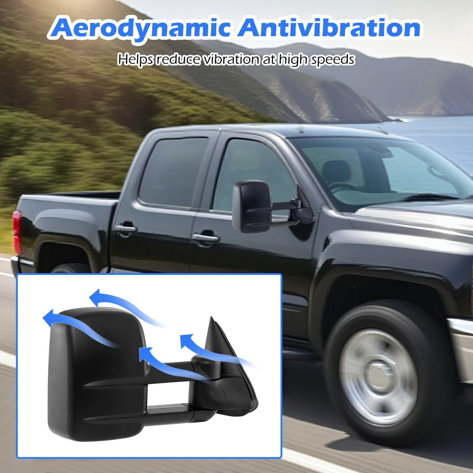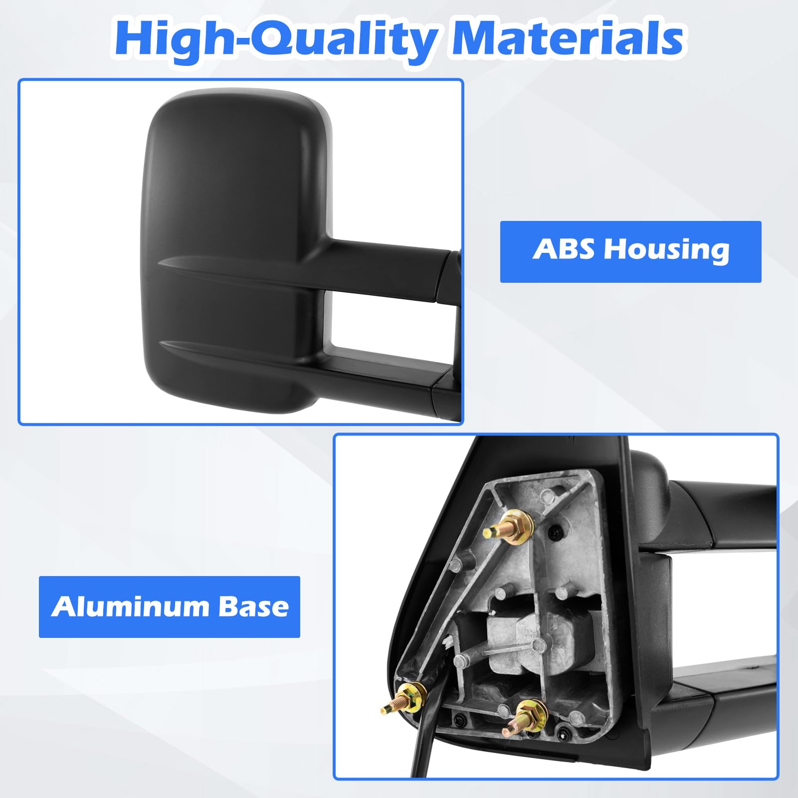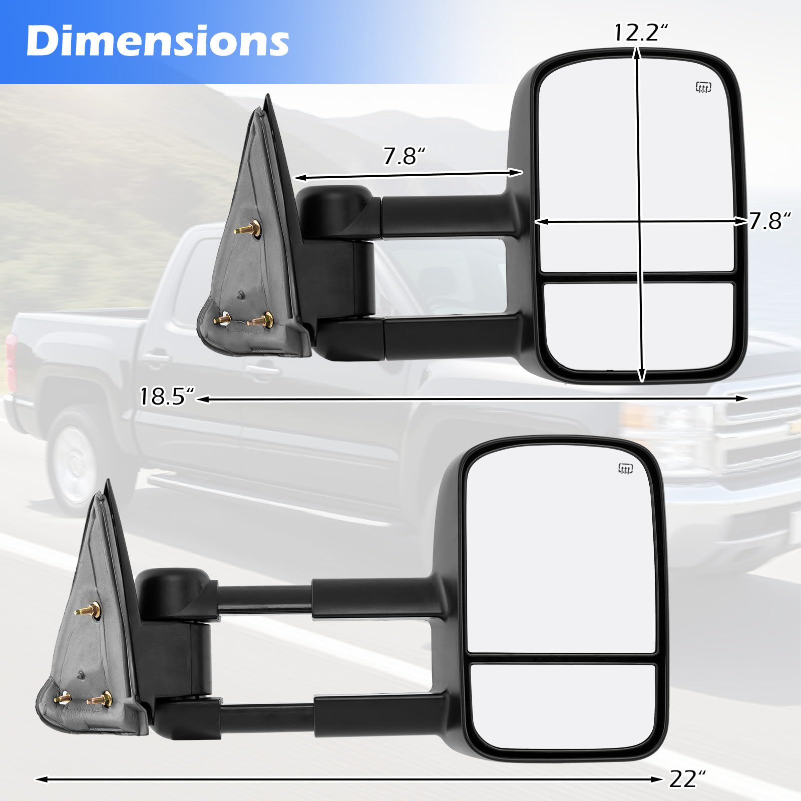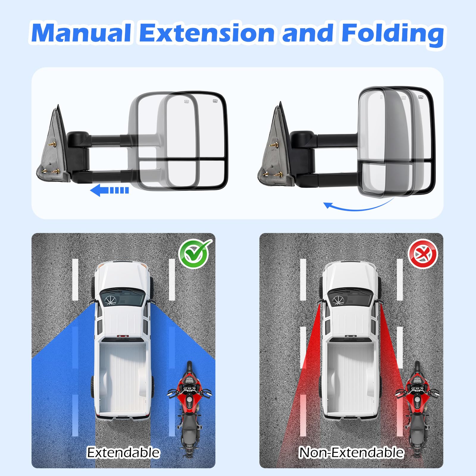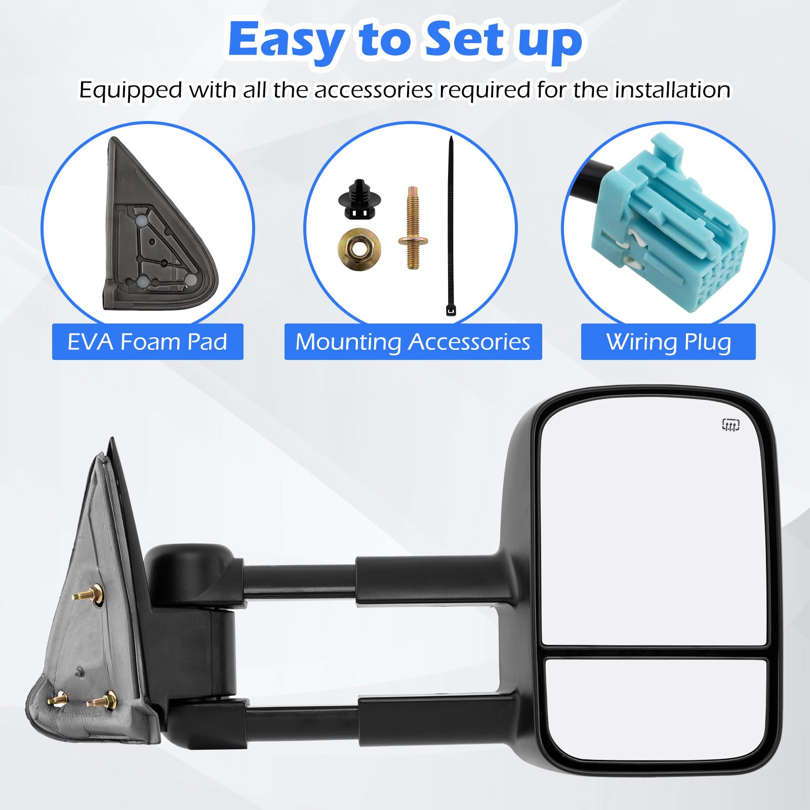 these tow mirrors are built for lasting performance. The electrically adjustable flat mirrors and manually adjustable convex mirrors cater to all your driving needs. For added safety, these towing mirrors feature power-heated technology. They can also be manually telescoped to accommodate wider loads and easily folded to prevent damage in tight spaces. Additionally, assembly is a breeze with all necessary accessories and detailed instructions included.