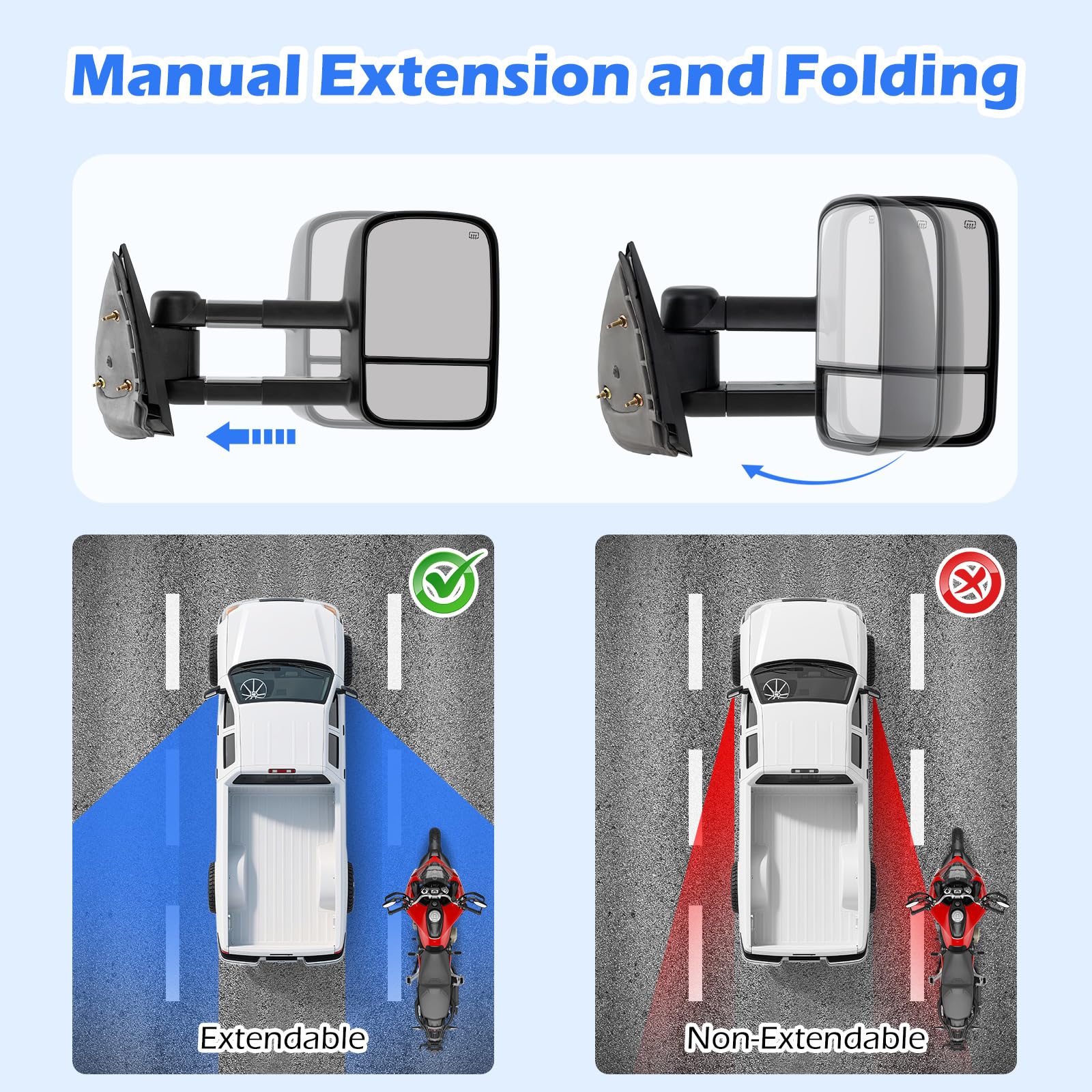 Made with high-quality materials, these tow mirrors are built for lasting performance. The electrically adjustable flat mirrors and manually adjustable convex mirrors gratify your driving needs. To enhance safety, these towing mirrors feature LED signal lights and a power-heated surface for clear visibility in different weather conditions. The side mirrors can also be manually telescoped to accommodate wider loads and easily folded to prevent damage in tight spaces. With all necessary accessories and detailed instructions, assembling these tow mirrors is a straightforward process.