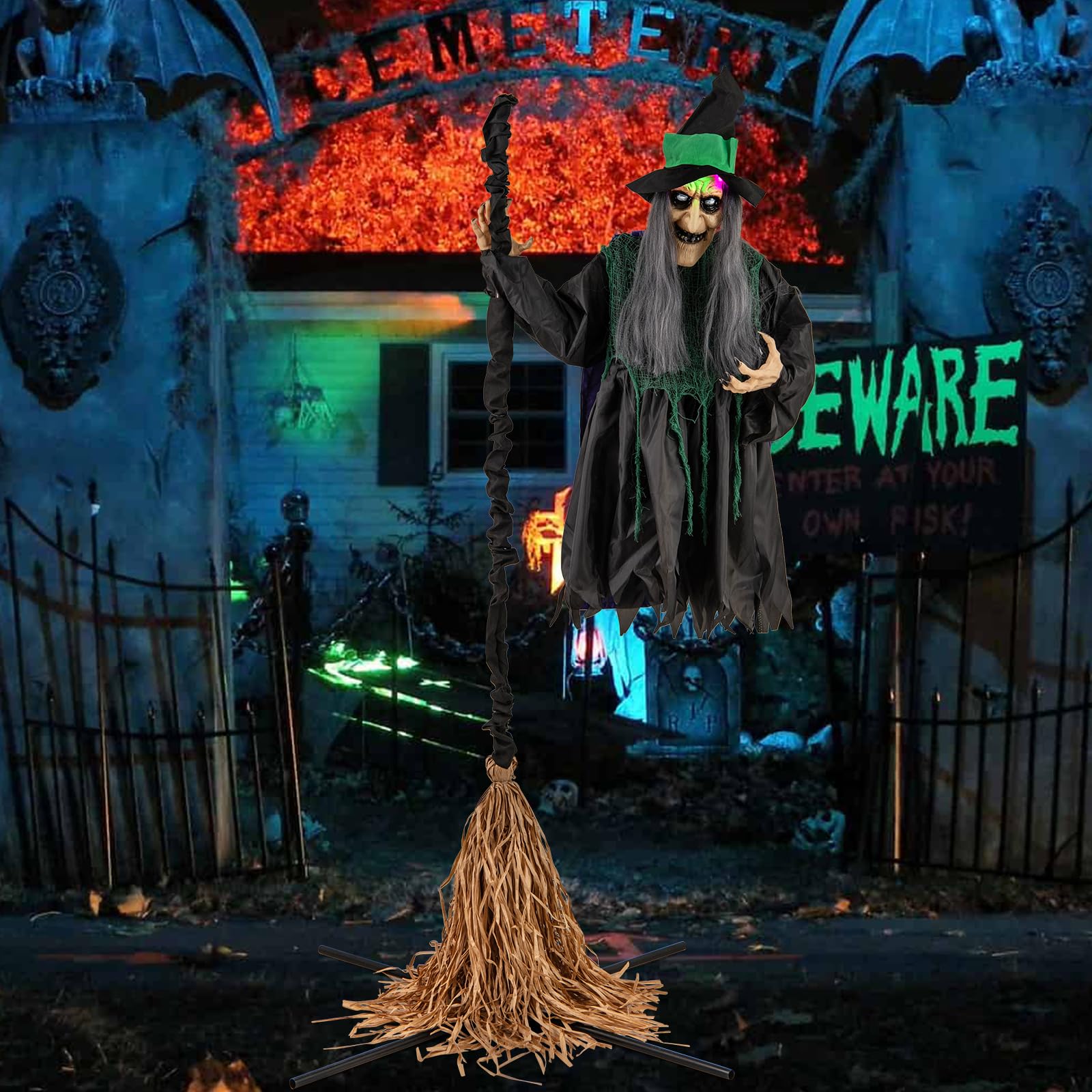 - Realistic Witch on Broom: Bring the spookiness of Halloween right to your doorstep with our witch on broom animatronic! Crafted with incredible attention to detail, this decoration features a vivid witch appearance complete with long hair, sharp claws, realistic broom, and ragged clothes, all perched on a lifelike broom for a truly haunting display.