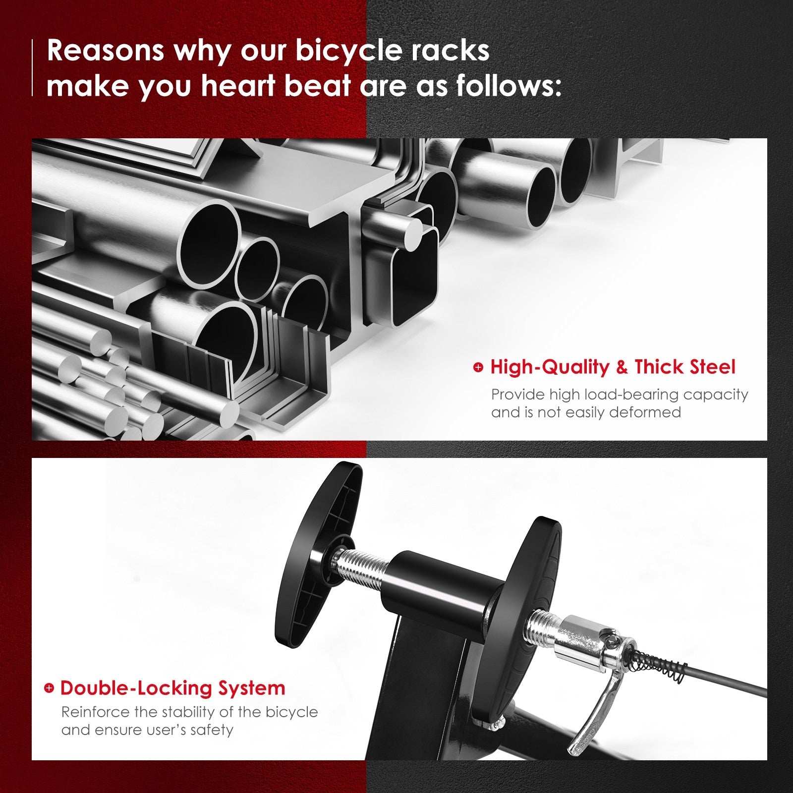 This indoor steel bicycle stand is made of solid steel and adopts pyramid structure design to ensure its stability. Nylon material can effectively protect the floor and increase the friction of the bicycle training frame so that it does not shake at will. Besides, our bike training frame suitable for 26'', 27'' and 28'' tires. What's more, folding design makes it easy to store without occupying a large space. In addition, our training car is light and compact enough for you to carry it anywhere. Come on, enjoy the convenience and comfort brought by sports.