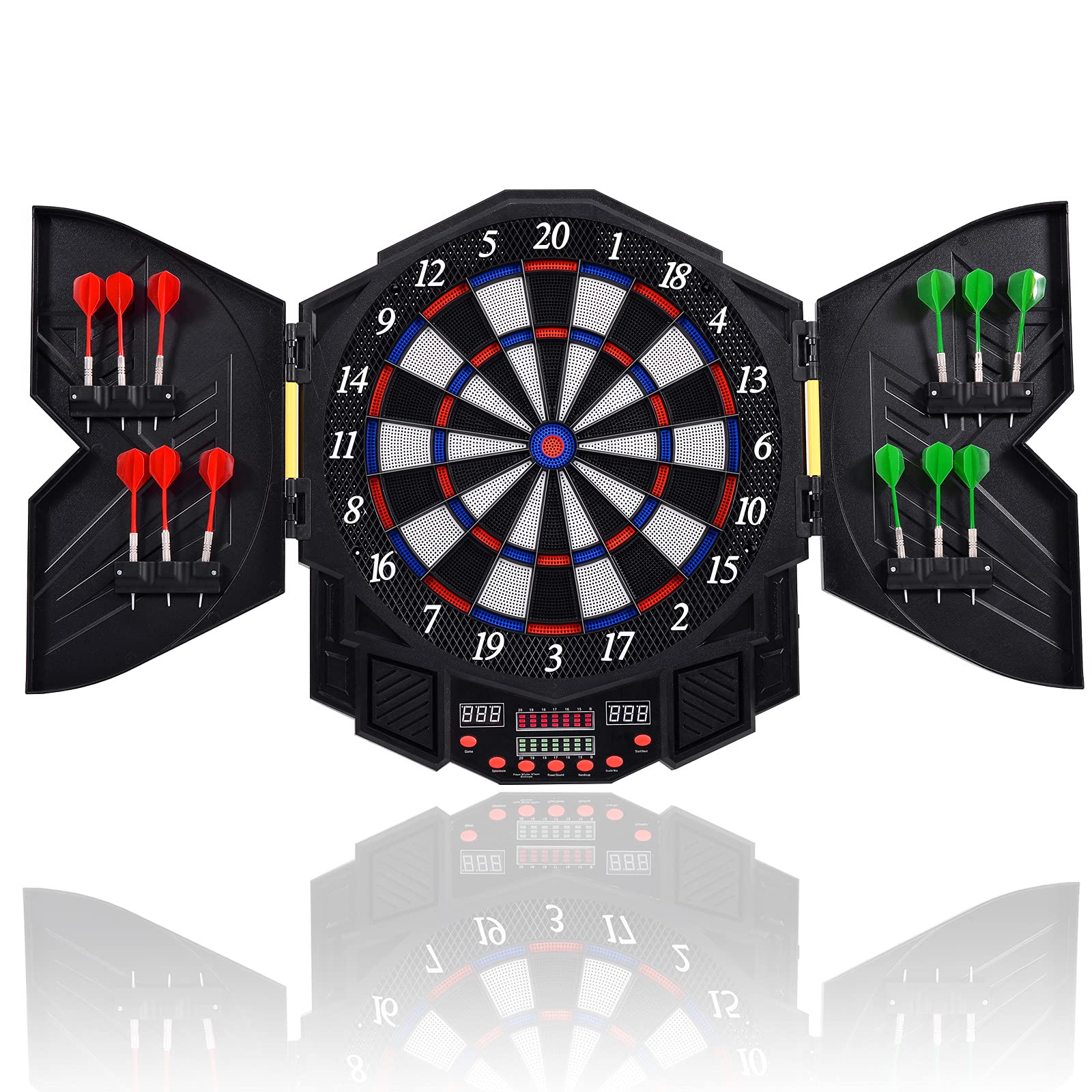 The Electronic Dart Board Is A Great Addition To Your Basement, Man Cave Or Game Room. It's Mounted In A Heavy Duty Plastic Cabinet with Ample Dart Storage. This Dartboard Is The Complete Set, Including a Cabinet, Electronic Dart Board, a Scoring LCD Display, And 12 Soft-Tip Darts. It Features A 13.5'' Target Area And 27 Other Games With 216 Exciting Variations. Up To 1-8 Players Can Play The Electronic Board At The Same Time, The Default Players Is 2, And Automatic Scoring For Each Segment. The Product Will Enter Sleep (Power Saving) Mode If No Key Press Or Dart Throw Action For 10 Minutes. Any Key Action Or Dart Throw Action On The Board Will Awake The Product. The Board Works With 4 AA Batteries Which Is Not Included.
