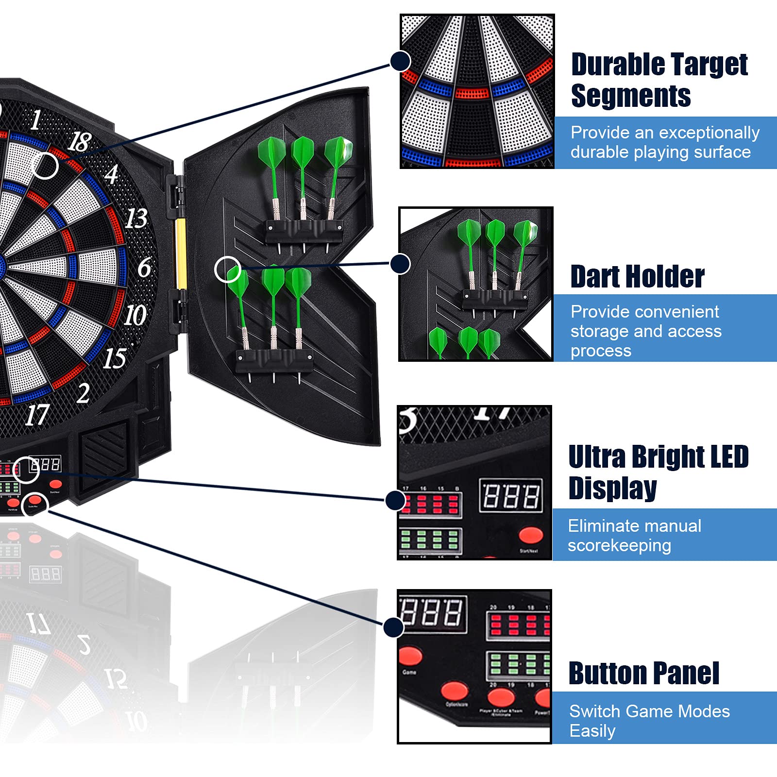 - Durable Material:?The shell of the dart is made of ABS, and the target area in the middle of the dart is made of PP, so the target area can receive multiple projections of the dart, and the whole of electronic darts is not easy to be damaged. As well as it has a stylish color scheme that showcases black, white, blue, and red.